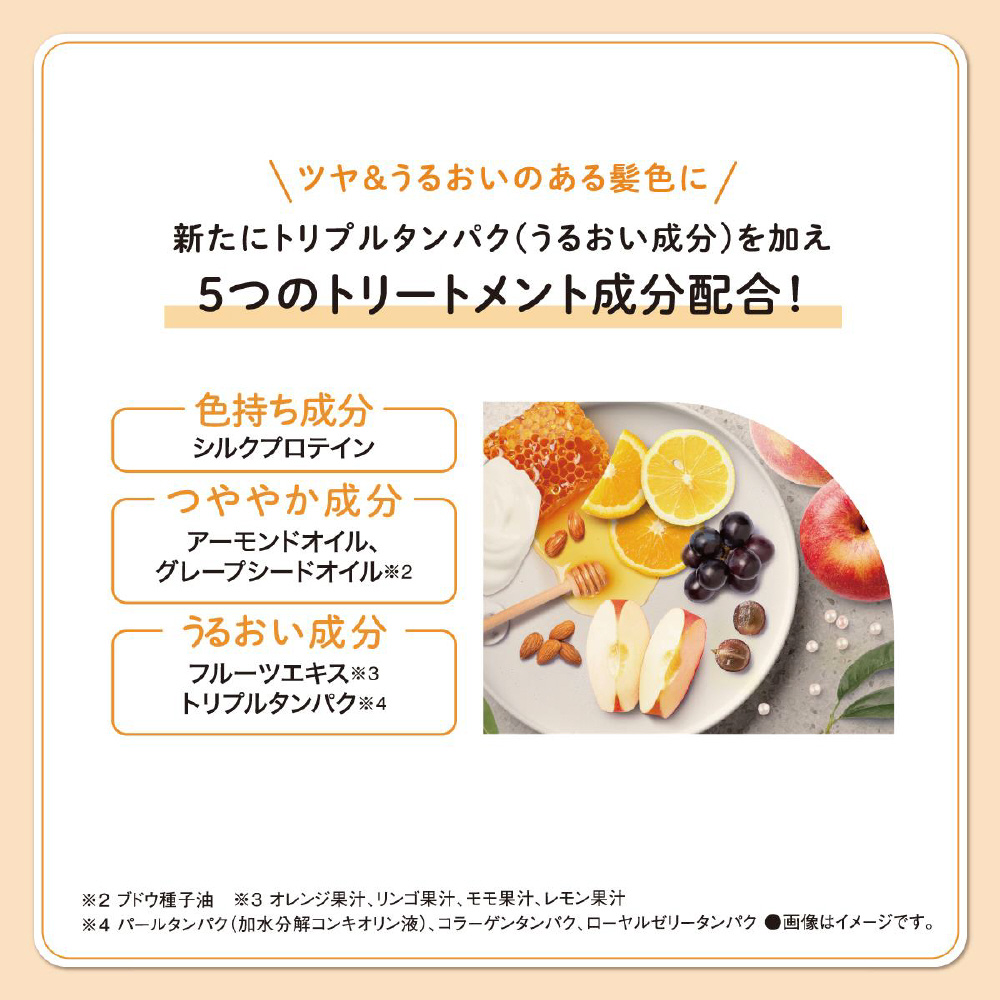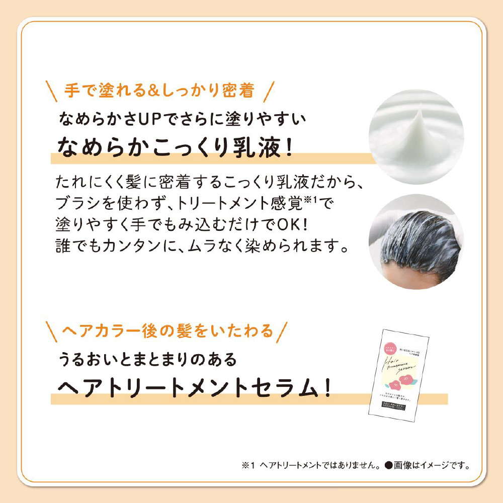 手で簡単に塗布できるこっくり乳液がタレずに密着。安心して使えるたっぷりサイズで、誰でもムラなくキレイに染められるヘアカラー。重たすぎない自然な暗髪に仕上がる髪色もどしシリーズ。