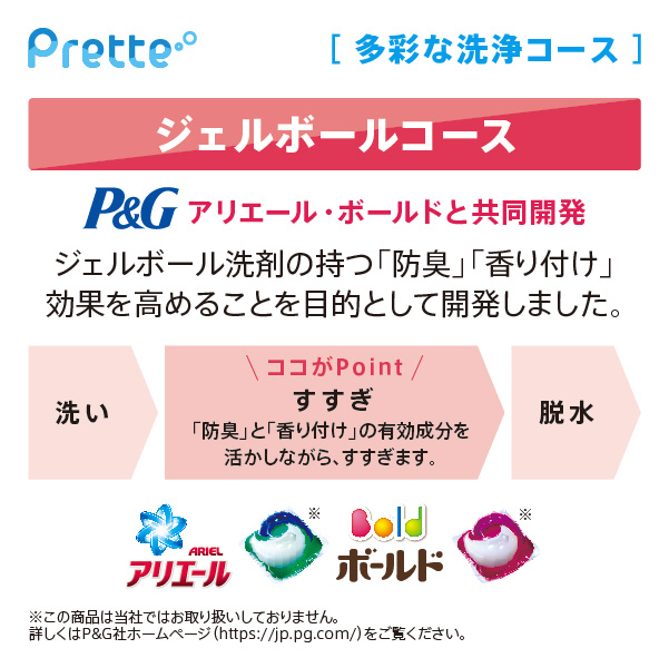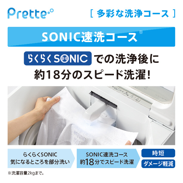 | コース | 標準、自分流、やさしく、おいそぎ、念入り、お好み柔軟剤、ジェルボール、ふとん・毛布、SONIC速洗、おしゃれ着、槽洗浄 |