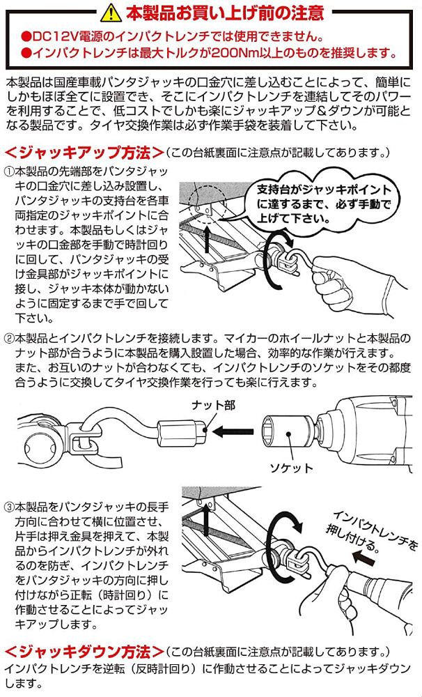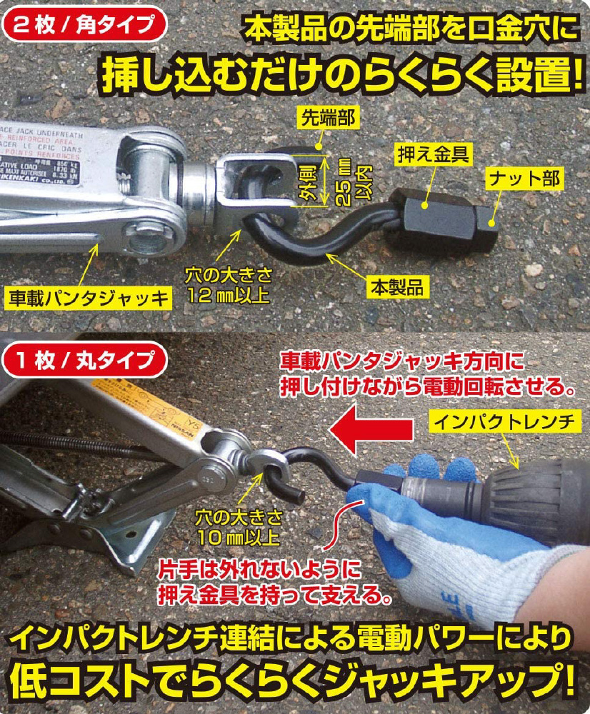 車載ジャッキ(パンタグラフジャッキ)の口金穴に取付ければ、お手持ちのインパクトレンチでジャッキアップ&ダウンが可能に!。対応ソケットサイズ:21mm、使用可能インパクトレンチ用ソケットサイズ。国産車載ジャッキの口金穴にほぼ全て簡単に取り付け可能。