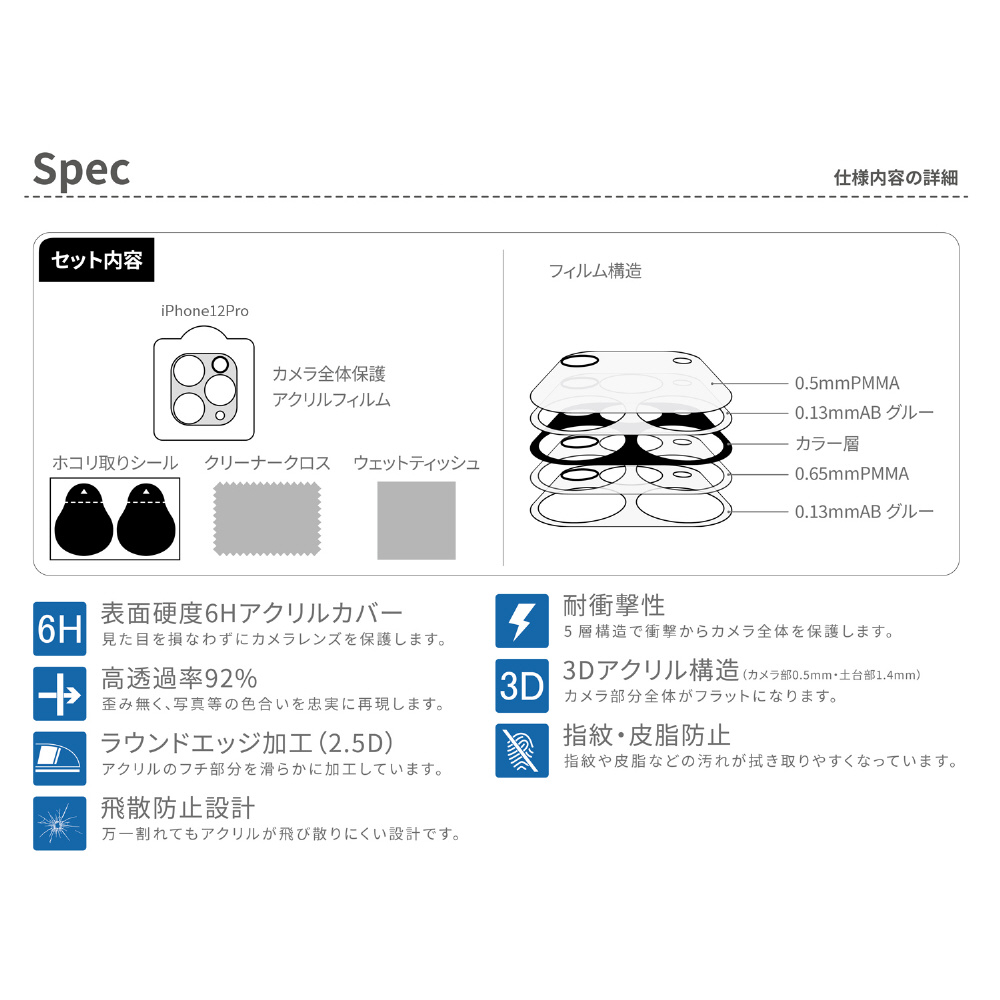 iPhone 12/12 Pro 6.1インチ対応カメラ全体保護アクリルフィルム クリア 【864】