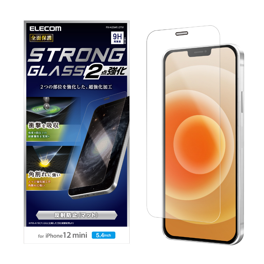 ゲーム操作に最適な長持ちコーティング!高硬度ガラスを更に2点で強化し、強度4倍以上の耐衝撃性を実現し、エッジ強化加工で角割れに強い反射防止タイプのiPhone2020年5.4inchモデル用液晶保護ガラスです。