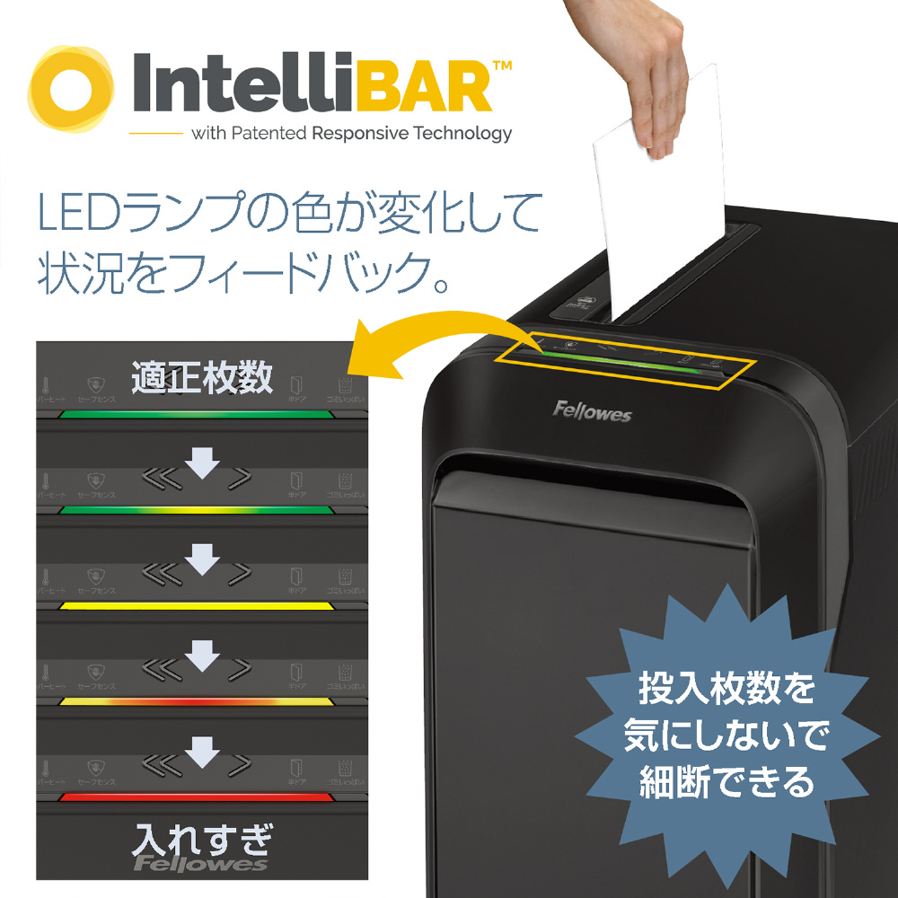 ペーパー投入口手前に設けられたLEDバーがライトの色の変化で使用状況をフィードバック。投入枚数や連続使用時間、細断くずのたまり具合など、シュレッダー使用時に気にかかることをグラフィカルに表示します。