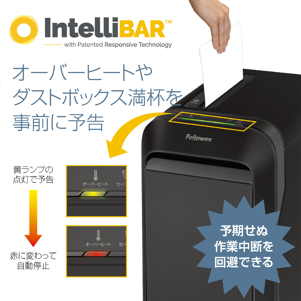 長時間使用していてオーバーヒートしそうになると細断が停止する前に黄ランプで予告。事前にリミットが分かることで突然作業が中断して機密書類を投入口に差し込んだまま放置することが避けられます。