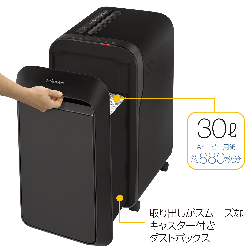 前面を覆うデザインのダストボックスは、取っ手が従来の小型シュレッダーより高い位置にあるので手がかけやすく、ダストボックス底部のローラーにより軽く引き出せます。