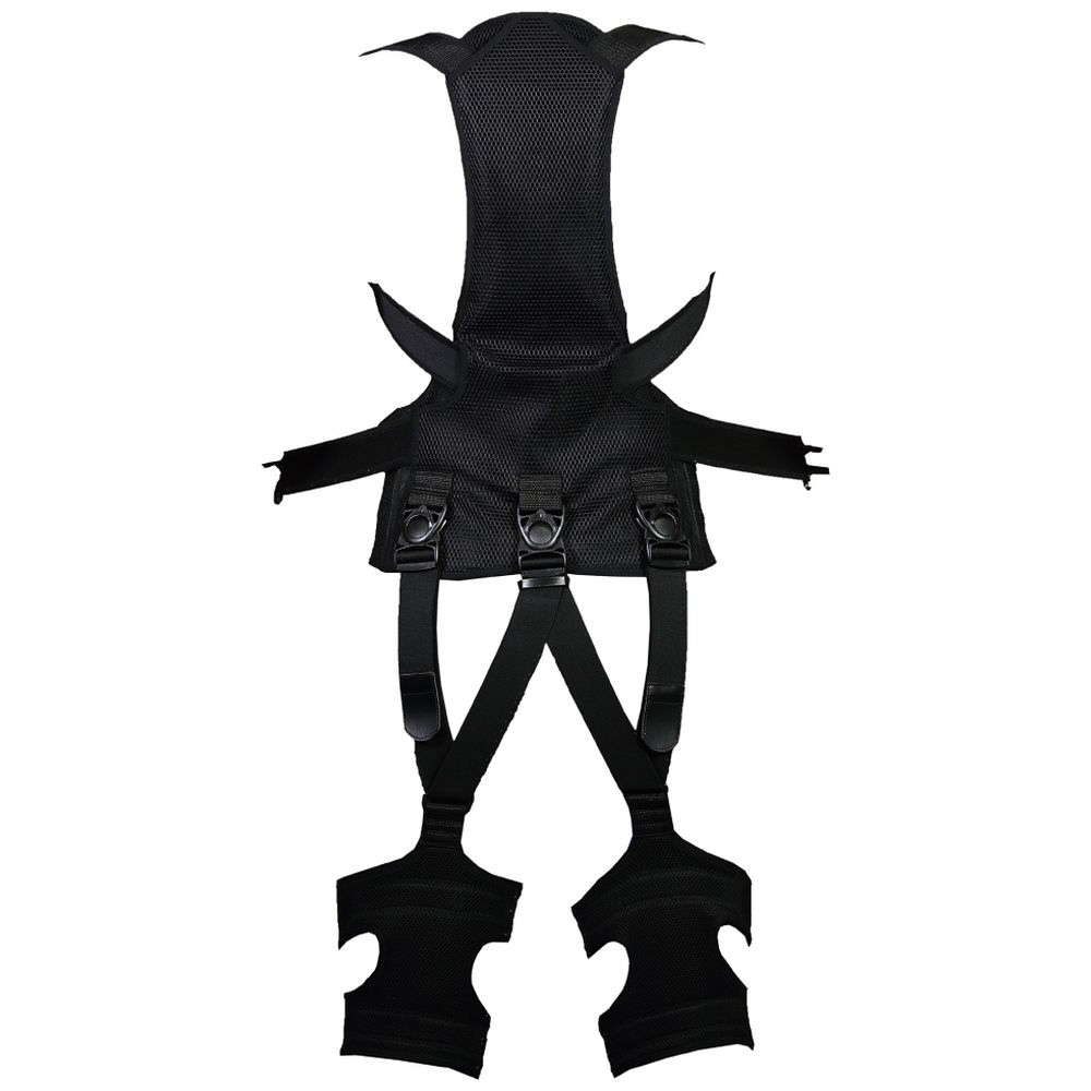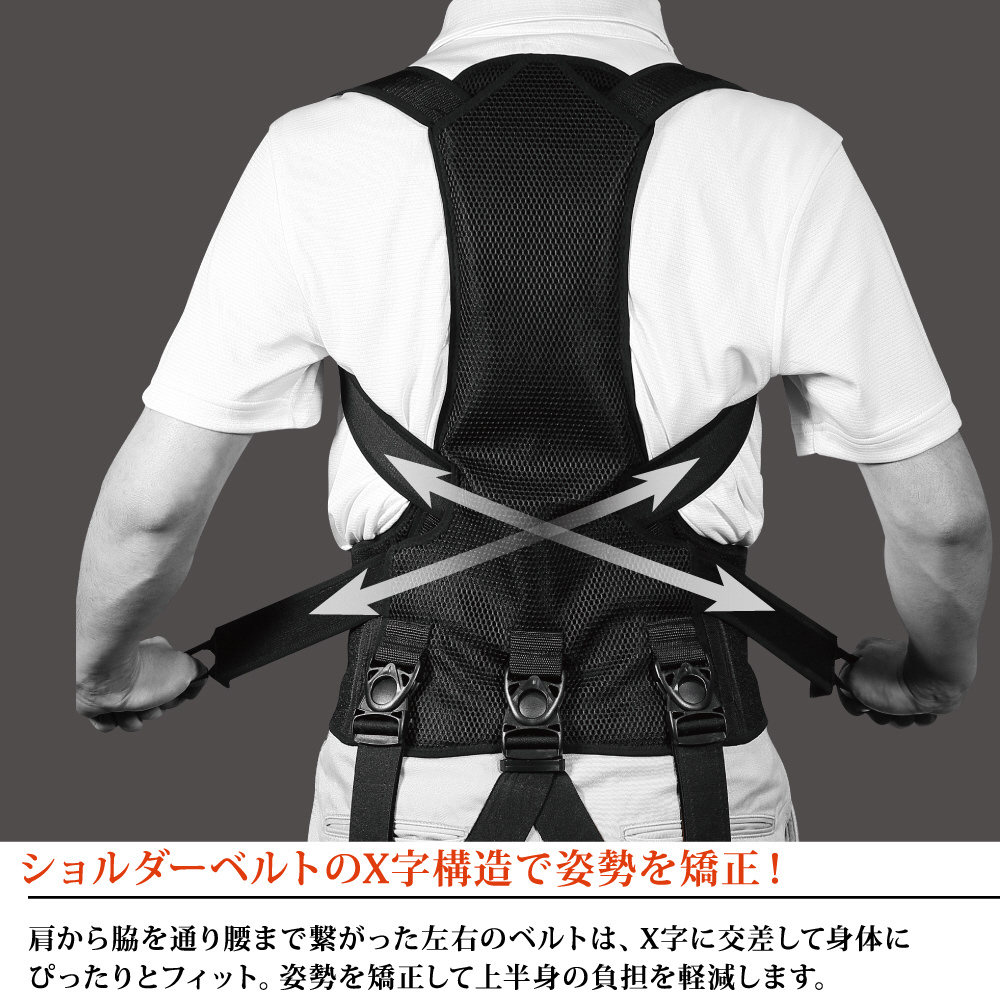 肩から脇を通り腰まで繋がった左右のベルトは、X字に交差して身体にぴったりとフィット。姿勢を矯正して上半身の負担を軽減します。