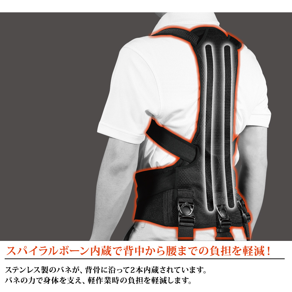 ステンレス製のバネが、背骨に沿って2本内蔵されています。バネの力で身体を支え、軽作業時に負担を軽減します。