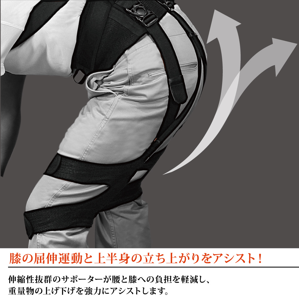 伸縮性抜群のサポーターが腰と膝への負担を軽減し、重量物の上げ下げを強力にアシストします。