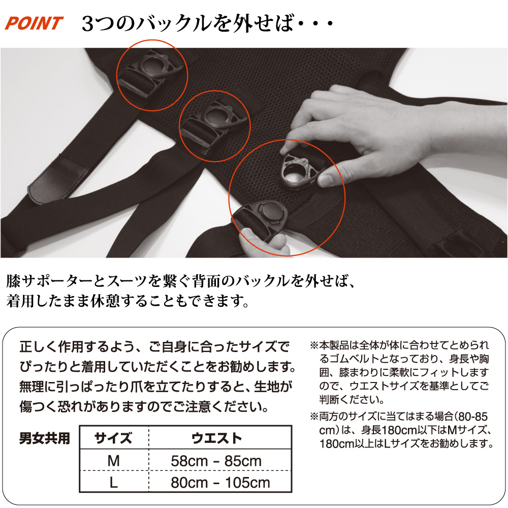 本製品は全体が体に合わせてとめられるゴムベルトとなっており、身長や胸囲、膝わまりに柔軟にフィットしますので、ウエストサイズを基準としてご判断ください。