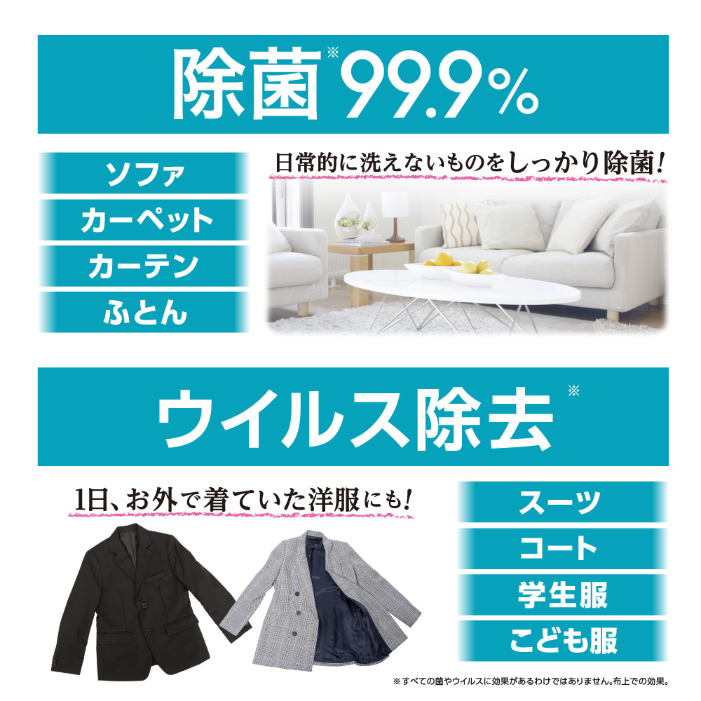 ●衣類・布製品に染みついた気になる汗・体臭・タバコ・料理・ペットなどのニオイを消臭・除菌。ウイルス除去にも。※すべての菌やウイルスに効果があるわけではありません。布上での効果。