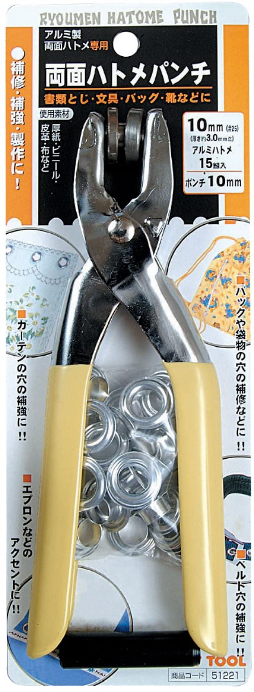 10mm(#25)(厚さ約3.0mm迄 )、アルミハトメ15組入 、ポンチ10mm。替えハトメ品番とサイズ:51251 両面型 アルミハトメ 約10mm。