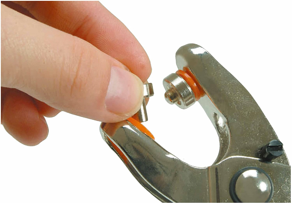 4mm(#200) 厚さ:1.5mm迄、下穴サイズ:5mm。プライヤー本体材質:鋼板+ニッケルメッキ、グリップ材質:エラストマー樹脂、軸受け部品(オレンジ):6-ナイロン、ポンチ材質:S45C、下敷き材質:ポリプロピレン、コマ材質:快削鋼+ニッケルメッキ。