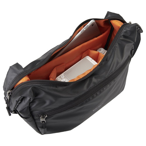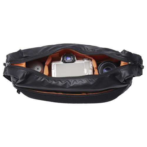 水や汚れに強くしなやかで軽量なポリカーボネートコーティング素材を採用した重量約300gの超軽量カメラショルダーバッグです。カメラ機材収納部へは上部のファスナーから素早くアクセス。フラットに折りたたむことができるので、トラベルカメラバッグとしてもお使いいただけます。