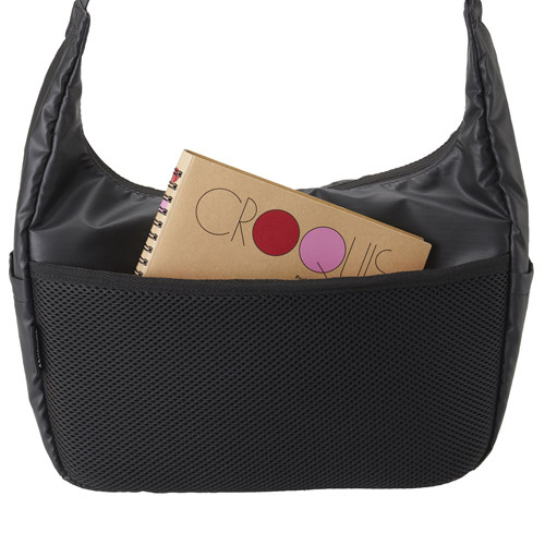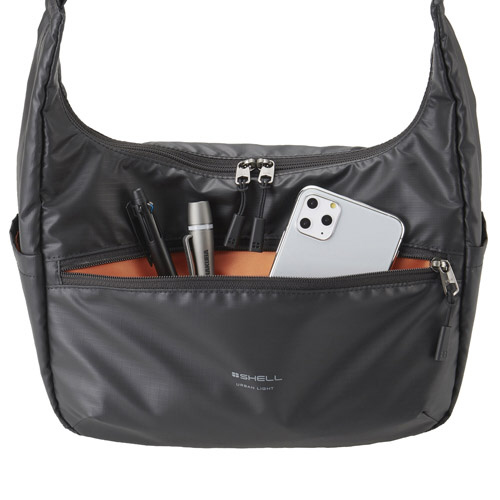 前面には小物の収納に便利なオーガナイザー仕様のファスナーポケット、背面にはタブレットPC収納に便利なポケットを装備。