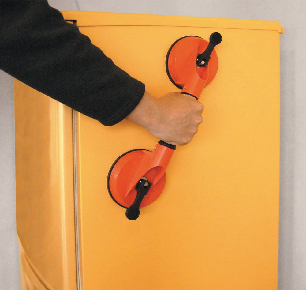 冷蔵庫などの家電製品、各種設備機器、大型ガラス、大理石、ロッカー、書庫、金庫など、取っ手のない物の運搬、移動、据えつけに大変便利です。大きくて、持ちにくい物を簡単に移動、据えつけできます。ダブル吸着で持ちやすく、無理のない安定した力で吸着物を移動、据えつけることができます。オフィス、修理工場、作業現場やご家庭の必需品です。