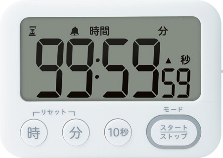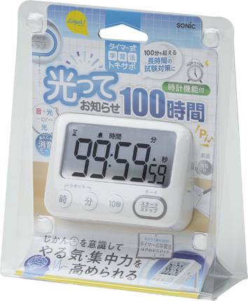 最大100時間まで時間が計れるので、長時間の試験対策や実験などの計測にも使えます。音のON/OFF設定が可能で、タイムアップを光でお知らせします。塾・図書館などの音が鳴ってほしくない場所でも安心して使えます。