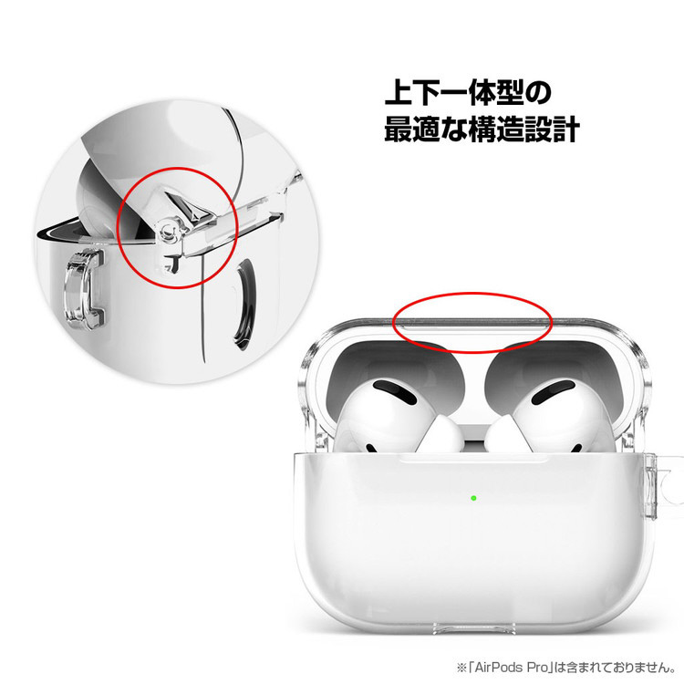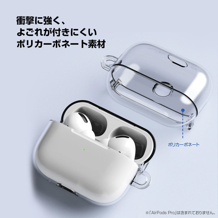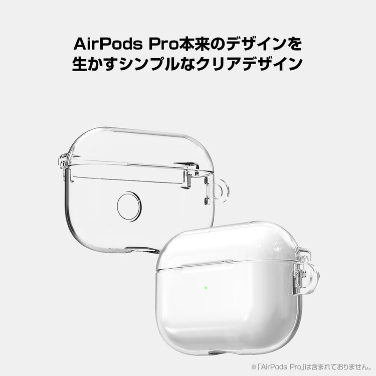 衝撃に強いポリカーボネート素材のクリアケースで、デバイス本体のデザインを生かすシンプルなAirPods Pro専用ケースです。