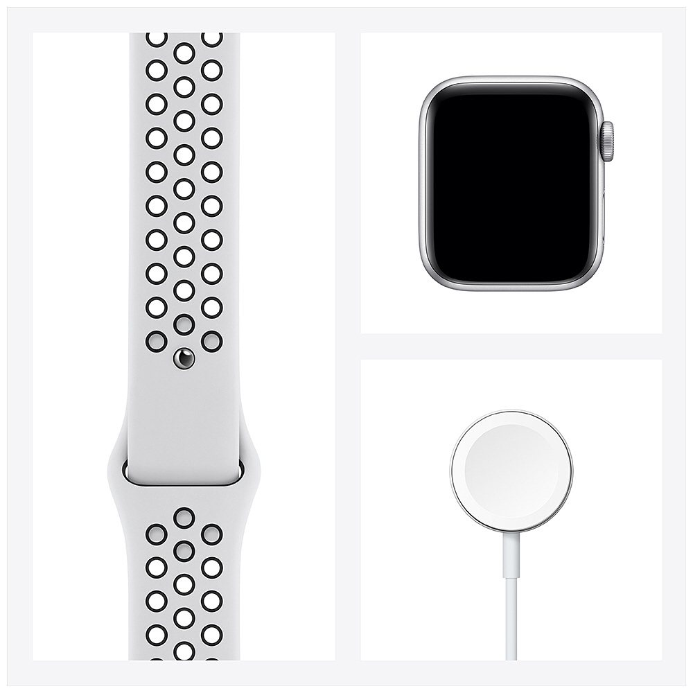 Apple Watch Nike SE(GPSモデル)第1世代- 40mmシルバーアルミニウムケースとピュアプラチナム/ブラックNikeスポーツバンド ‐ レギュラー シルバーアルミニウム MYYD2J/A