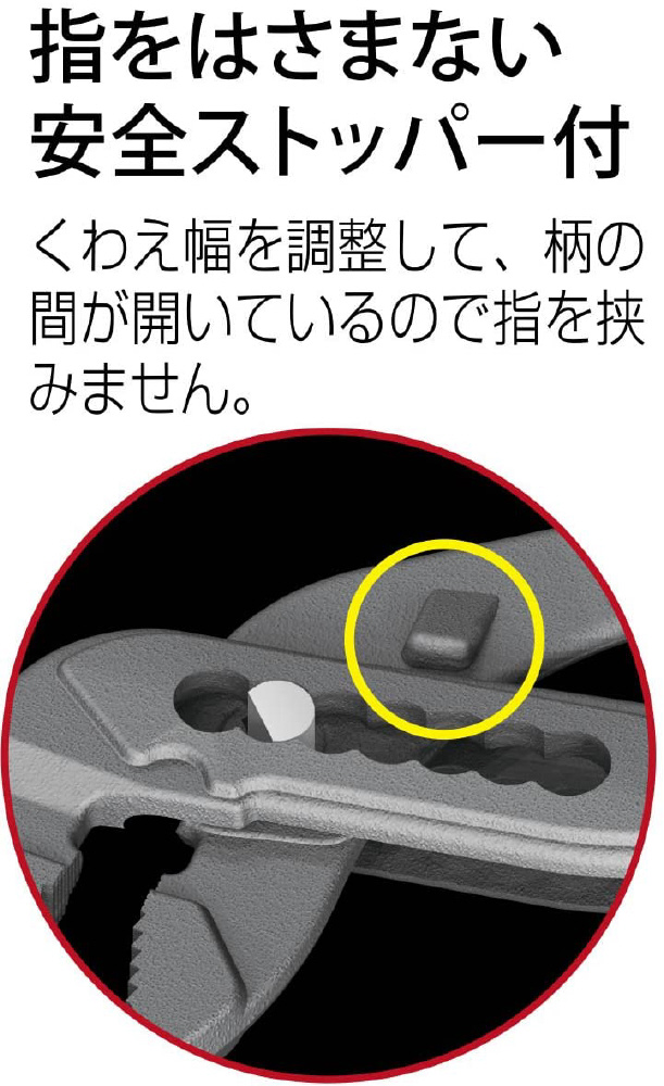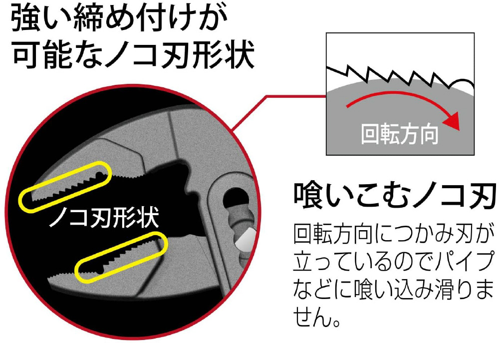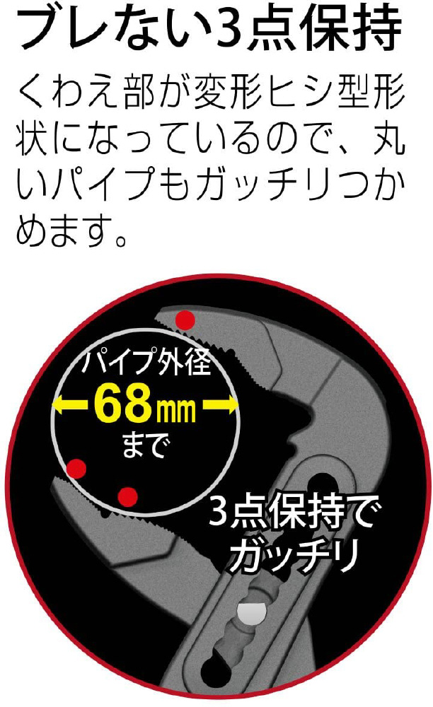 ジョイント部を両側から挟み込む三枚合わせ構造を採用。3点保持非対称つかみ刃でガッチリ掴む。水道・ガス等の配管作業に。