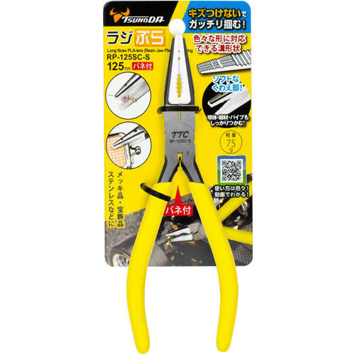 ラジぷら専用交換樹脂パッド(125mm/165mm共通部品)も別売でご用意しております。サイズ:全長/140mm 頭部幅/13mm 頭部厚/8mm 柄幅/53mm 先端長/30mm 重量/75g。品質表示:素材/本体・機械構造用炭素鋼 柄被覆/塩化ビニール くわえ部/ポリアミド樹脂。