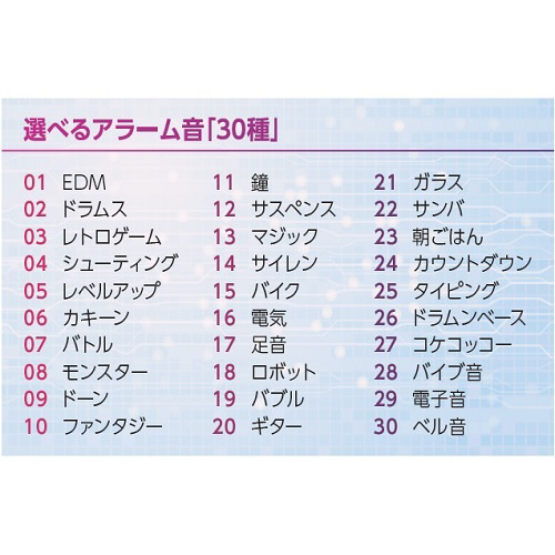 圧倒的大音量アラーム「ライデン」シリーズ。操作性が向上したコンパクトなフォルムに、30種類のアラーム音を搭載。