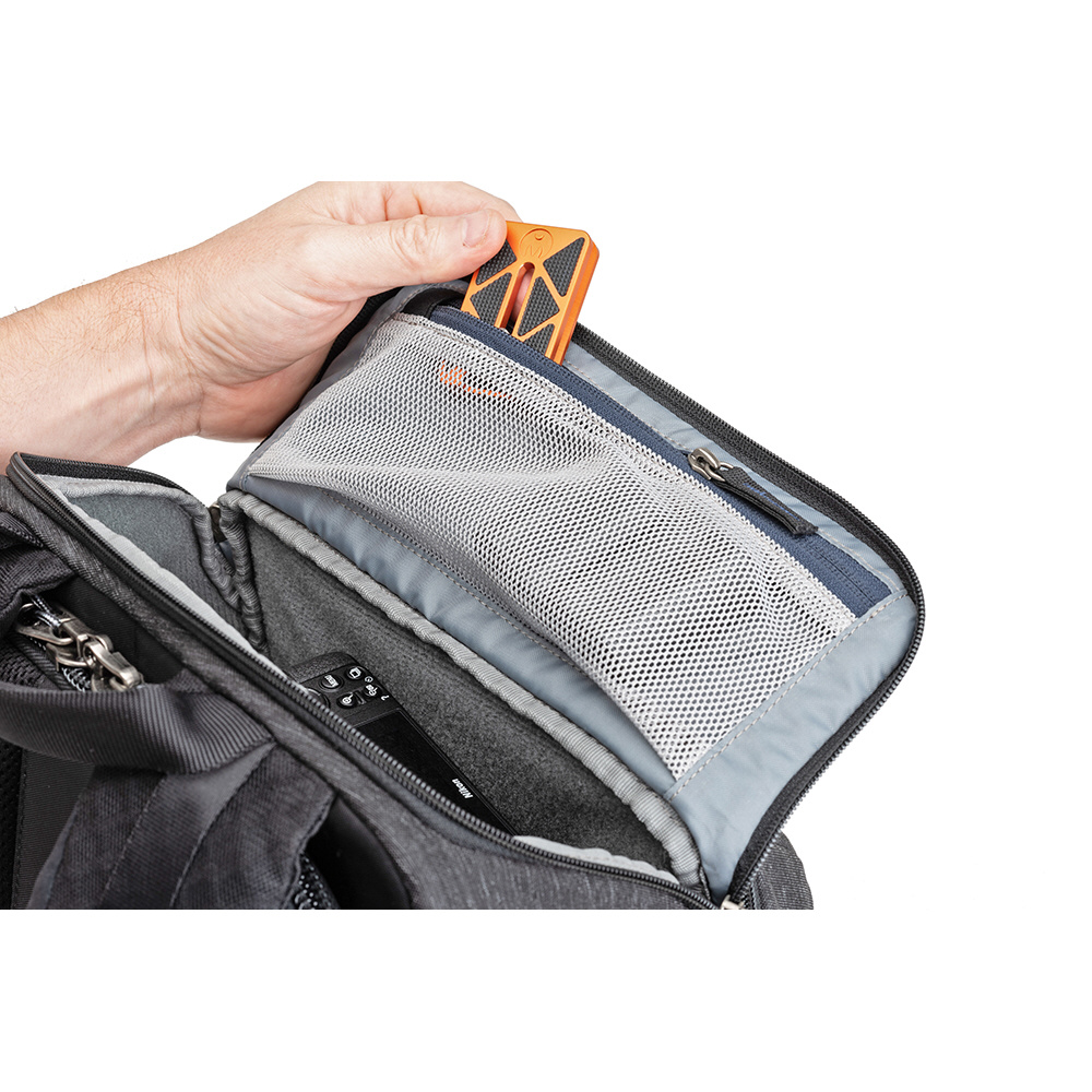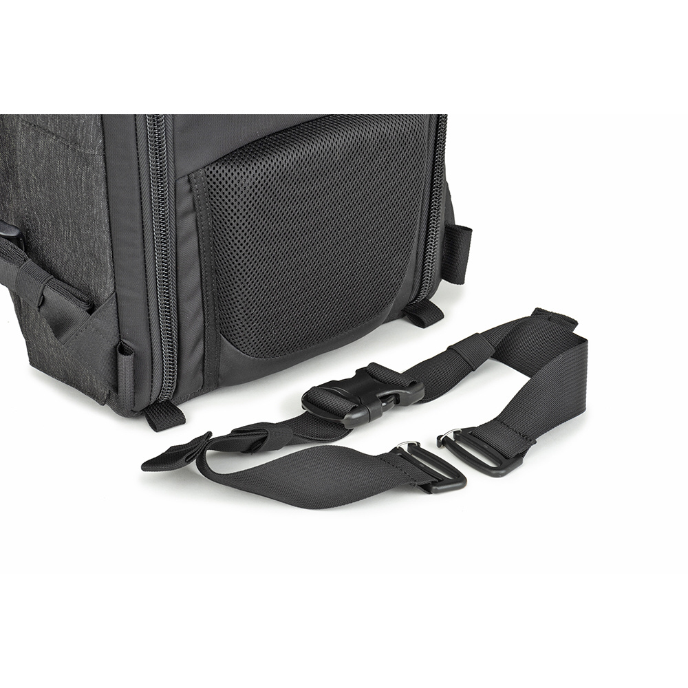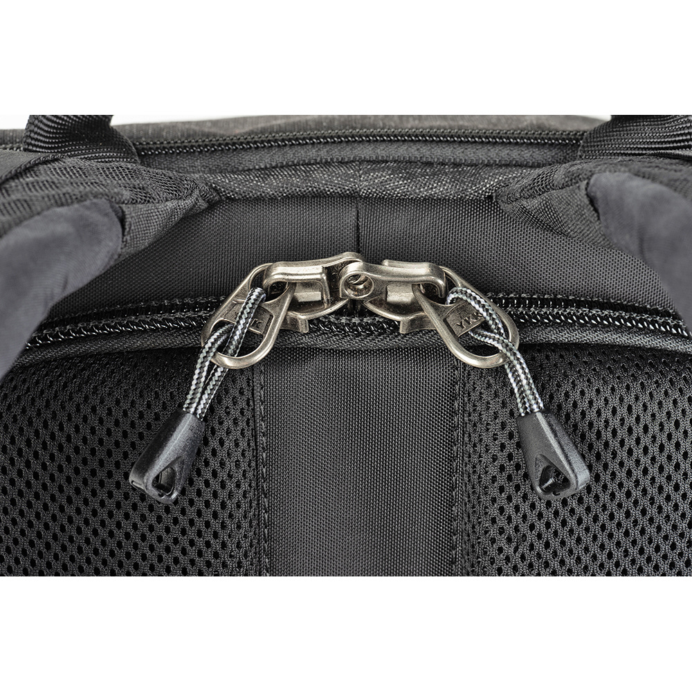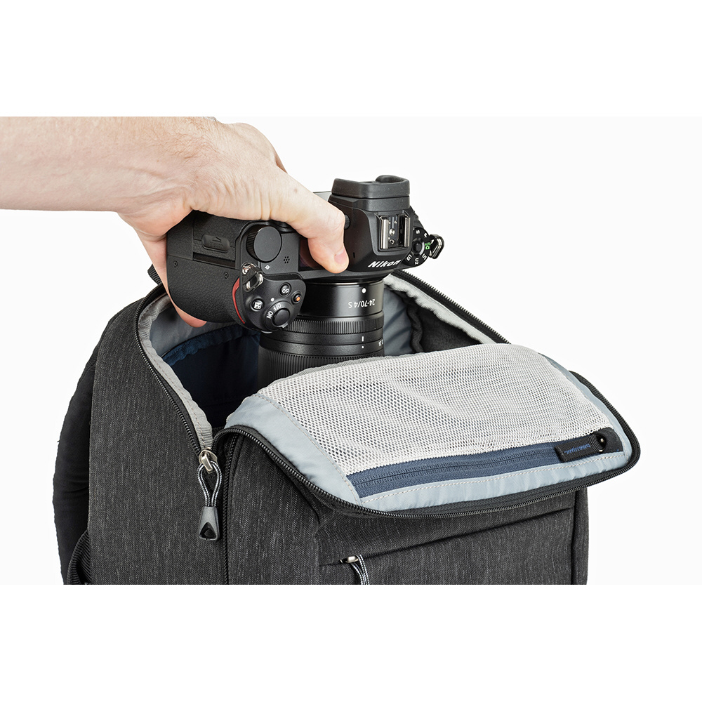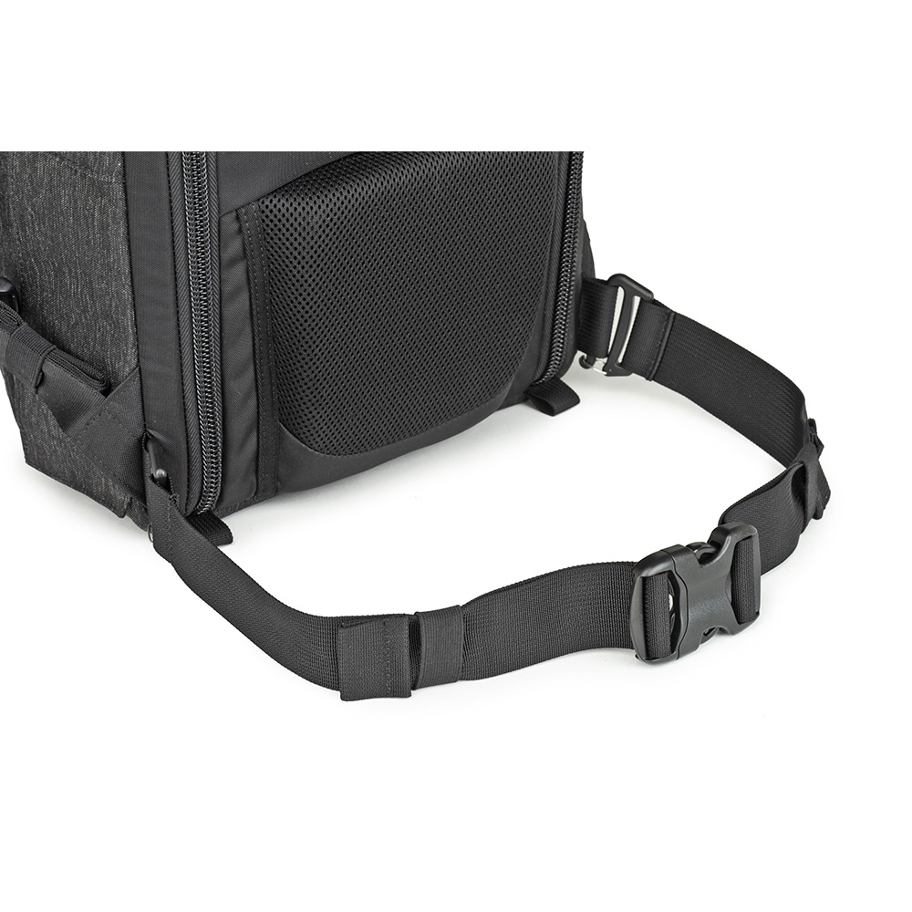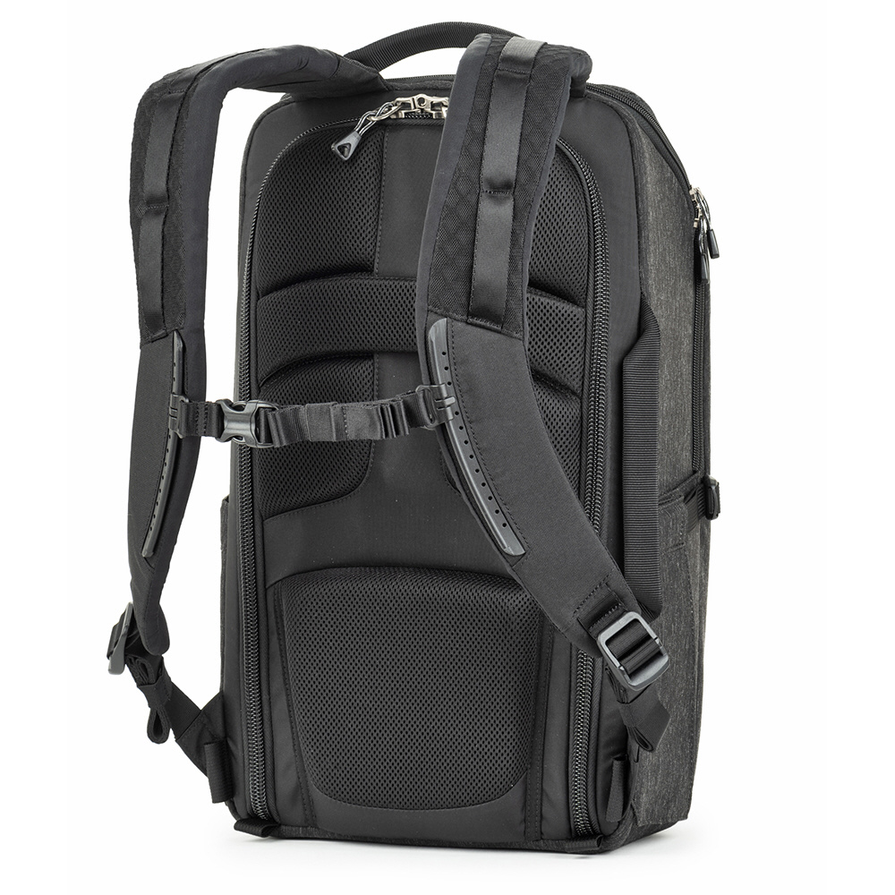 バックパネルは大きく全体が開くためメインコンパートメントを確認でき、バッグ上部からもスピーディーに内部にアクセスできます。取り外し可能なウエストベルトを装着すれば、容量いっぱいに収納しても快適な持ち運びを叶えます。また、バックパネル裏側とトップフラップ内側にはそれぞれメッシュポケットがあり、フィルターやバッテリーなどアクセサリー類を収納可能。前面ポケットにはノートPC やタブレット収納部のほか、オーガナイザーポケット、メッシュポケットを備えています。バッグ背面にはパススルーが付いています。