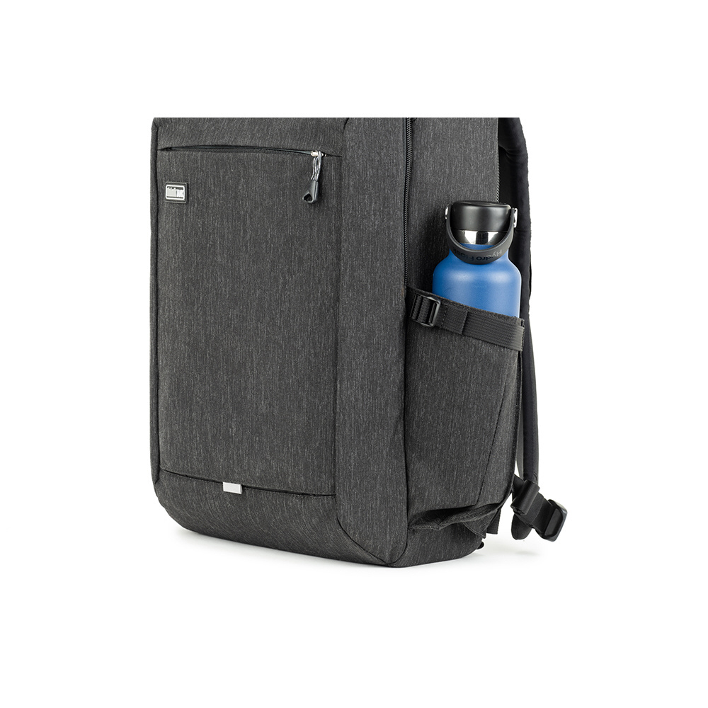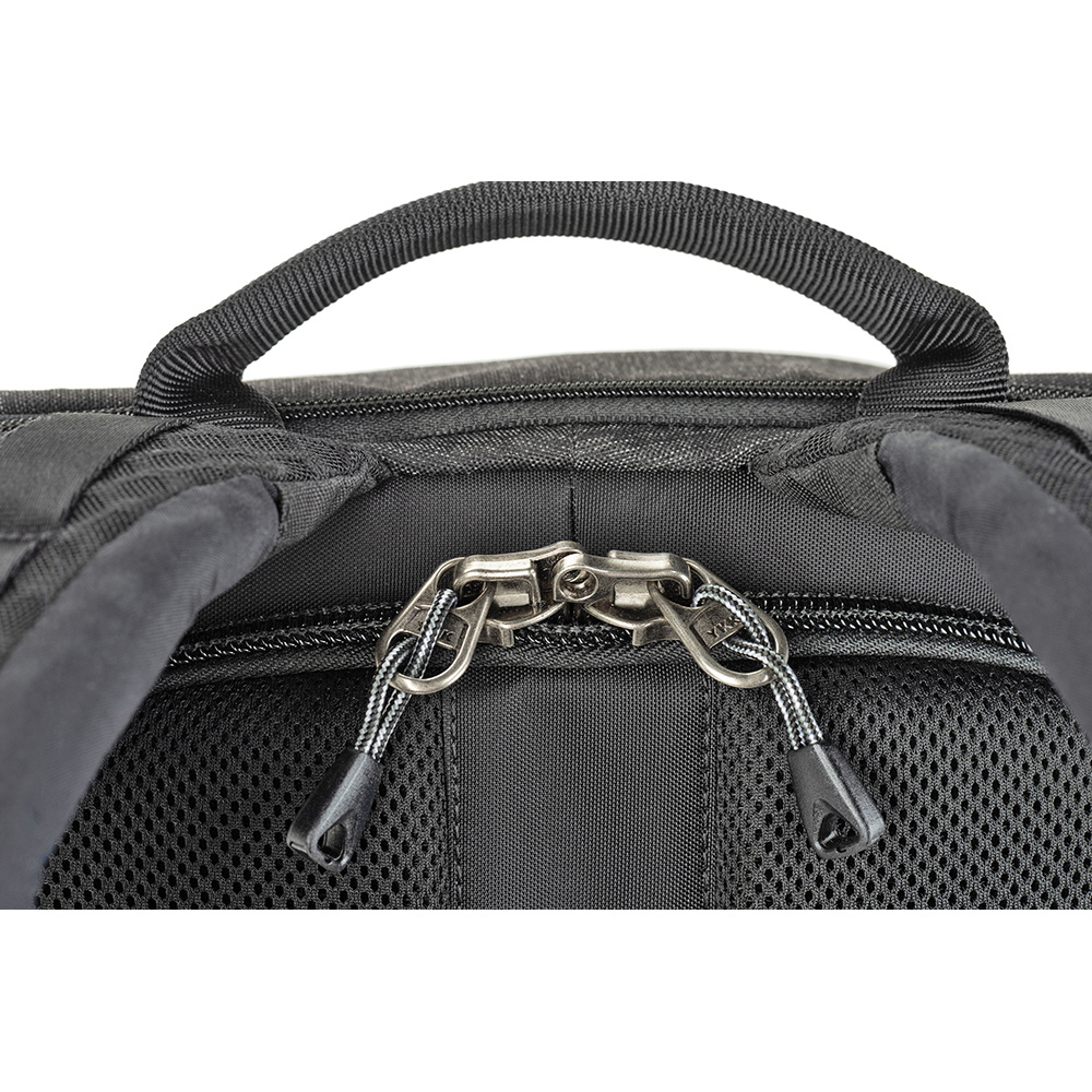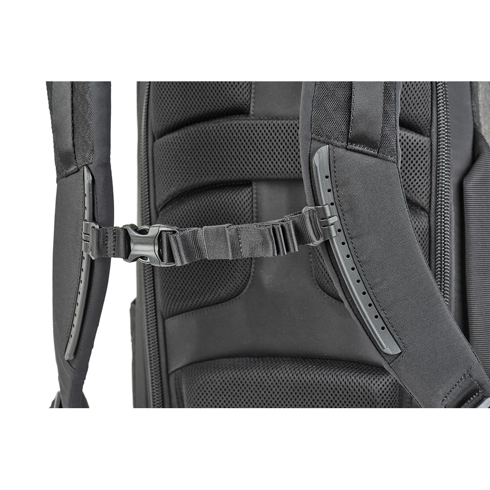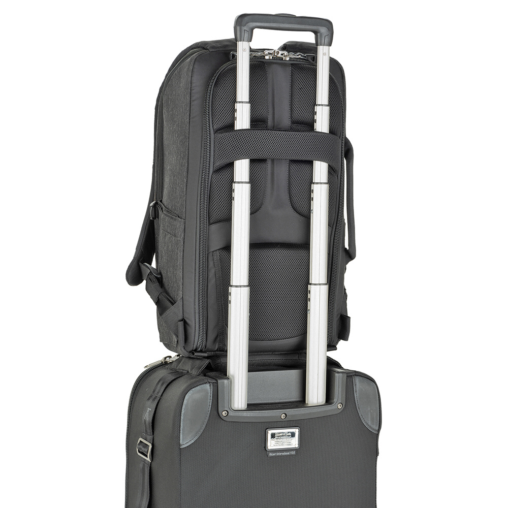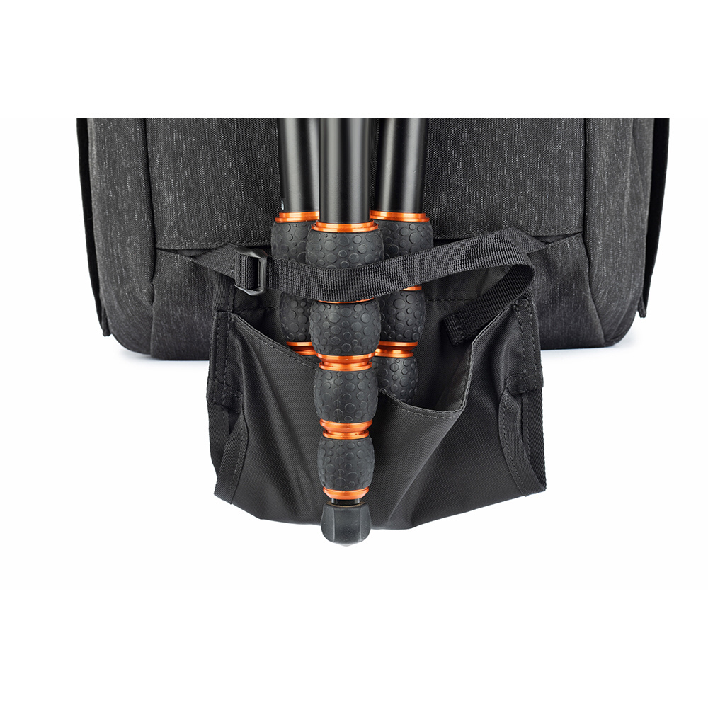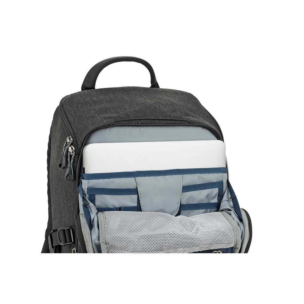 バックパネルは大きく全体が開くためメインコンパートメントを確認でき、バッグ上部からもスピーディーに内部にアクセスできます。取り外し可能なウエストベルトを装着すれば、容量いっぱいに収納しても快適な持ち運びを叶えます。また、バックパネル裏側とトップフラップ内側にはそれぞれメッシュポケットがあり、フィルターやバッテリーなどアクセサリー類を収納可能。前面ポケットにはノートPC やタブレット収納部のほか、オーガナイザーポケット、メッシュポケットを備えています。バッグ背面にはパススルーが付いています。