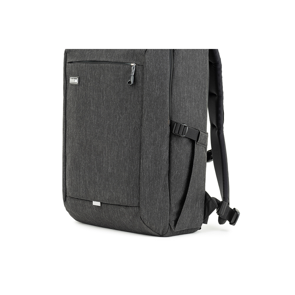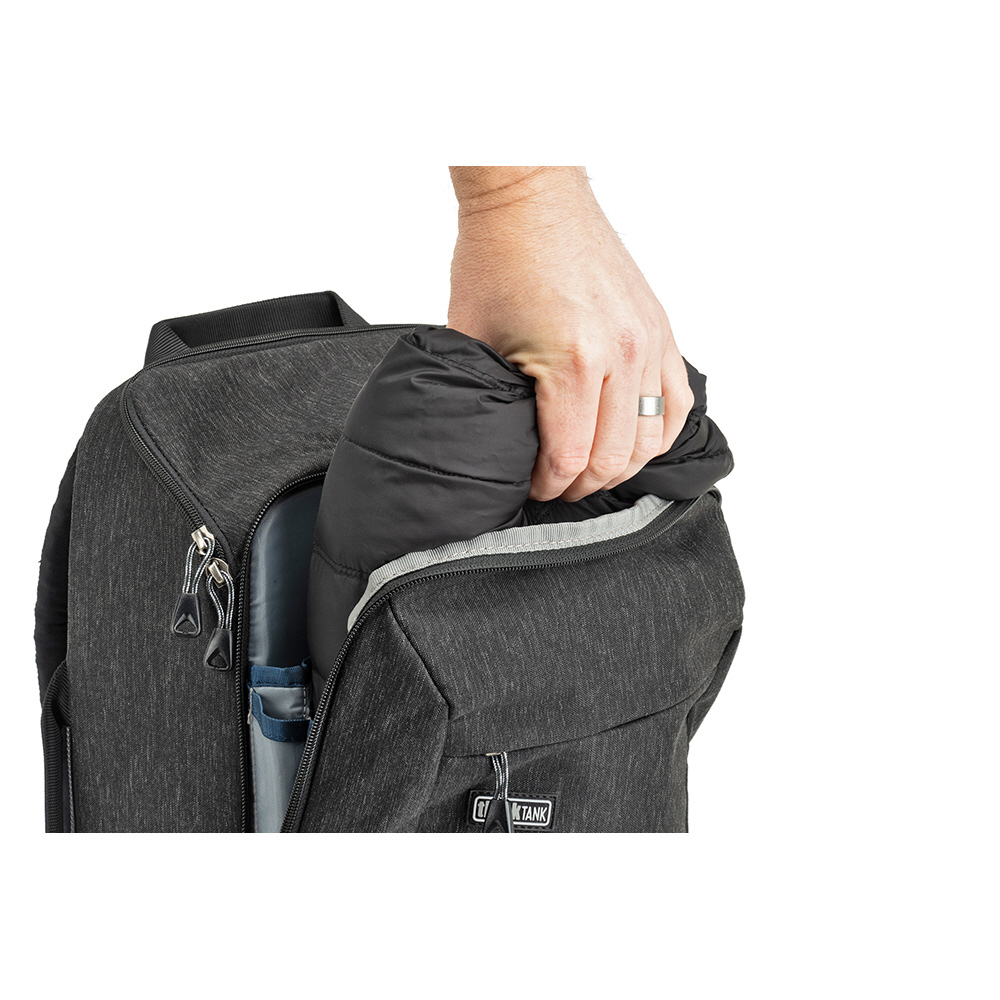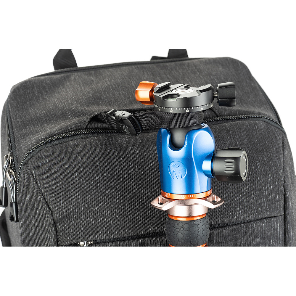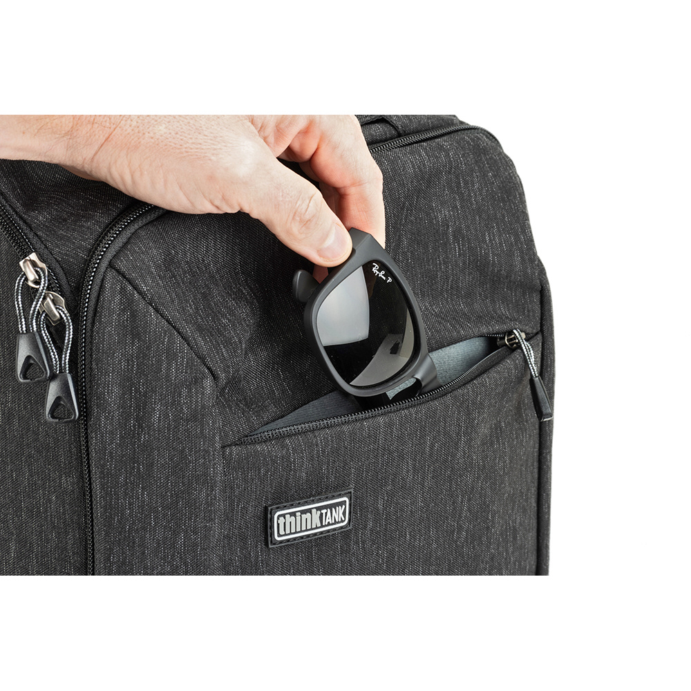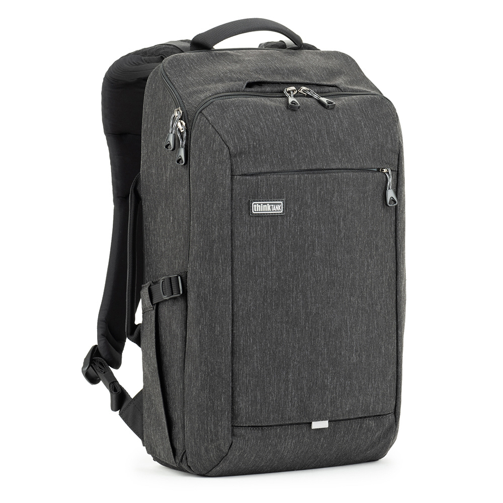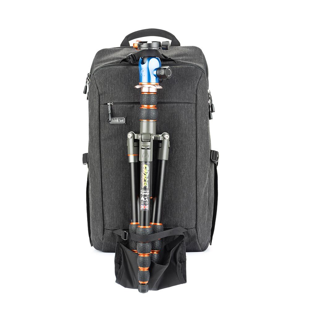 バックパネルは大きく全体が開くためメインコンパートメントを確認でき、バッグ上部からもスピーディーに内部にアクセスできます。取り外し可能なウエストベルトを装着すれば、容量いっぱいに収納しても快適な持ち運びを叶えます。また、バックパネル裏側とトップフラップ内側にはそれぞれメッシュポケットがあり、フィルターやバッテリーなどアクセサリー類を収納可能。前面ポケットにはノートPC やタブレット収納部のほか、オーガナイザーポケット、メッシュポケットを備えています。バッグ背面にはパススルーが付いています。