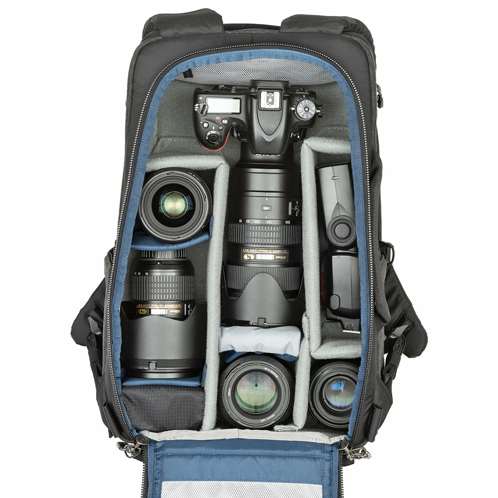 収納目安:70-200mm F2.8 を装着した中型一眼レフまたはミラーレスボディ2 台、レンズ2-5 本、ストロボなどのアクセサリー、16 インチノートPC