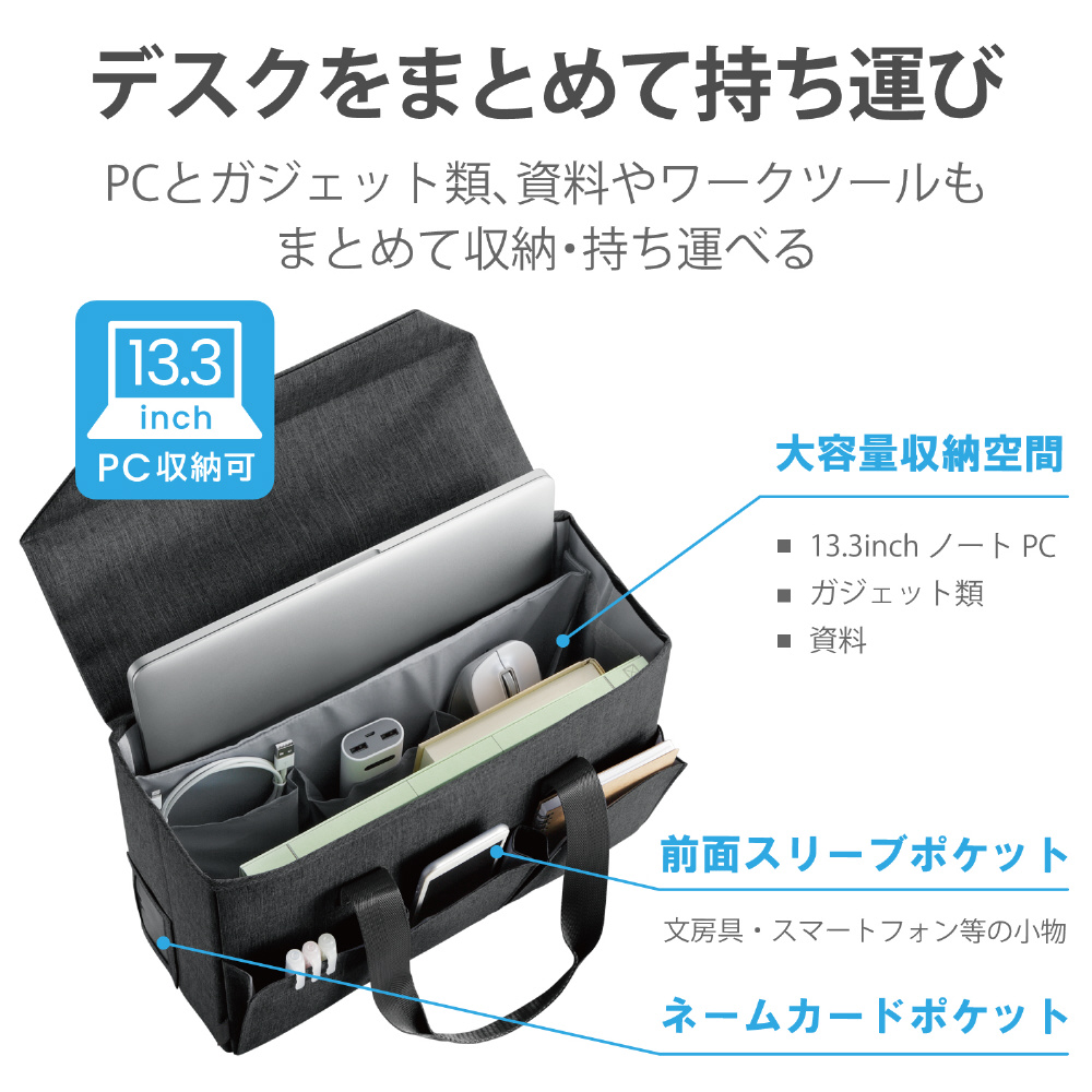 資料やワークツールをまとめて収納・保管。在宅ワークの仕事道具の管理や、社内移動の際の荷物運搬に便利な、大容量のボックストートバッグです。