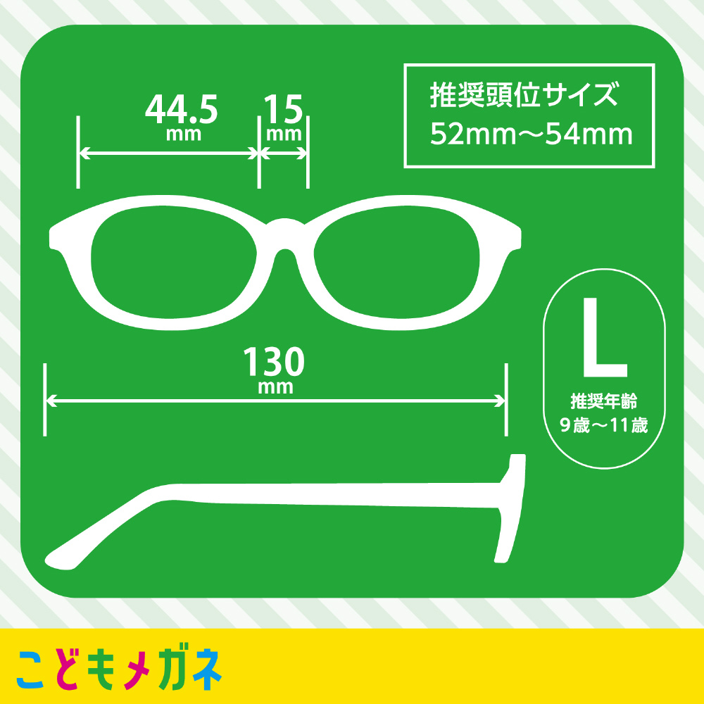 | 仕様1 | [Lサイズ]推奨年齢:9〜11歳 フレームタイプ:ウェリントン レンズカラー:クリア サイズ:44.5□14-130 重量:17g レンズの素材:プラスチック レンズ枠の素材:プラスチック テンプルの素材:プラスチック |