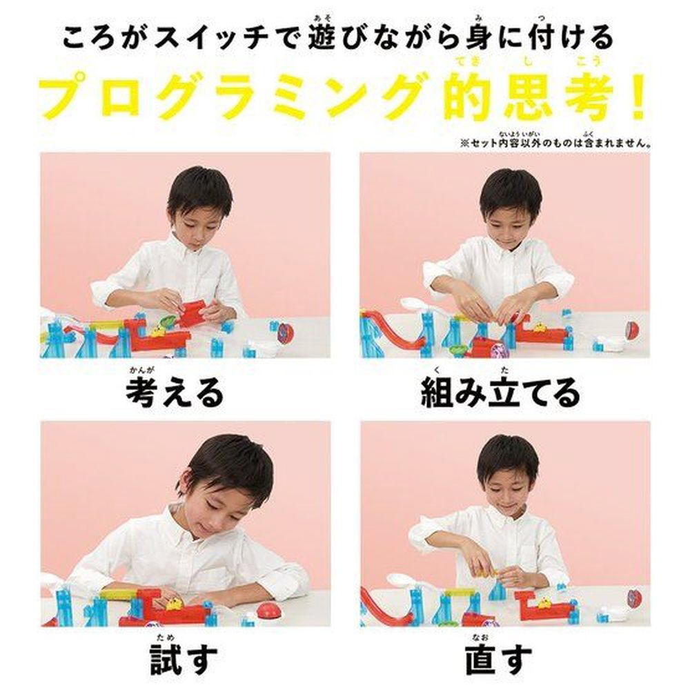 ブロックでコースを組む遊びの中で「考える」「組み立てる」「試す」「直す」の4つのフローで