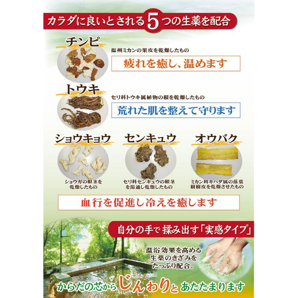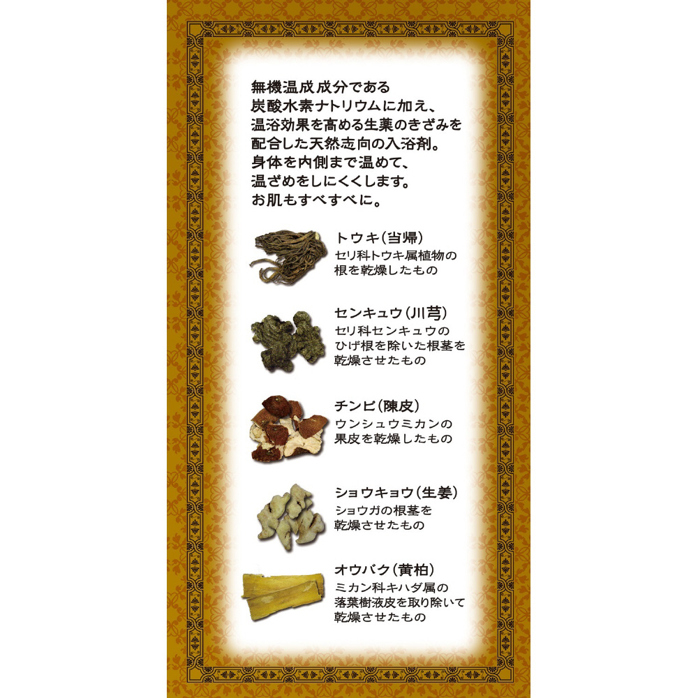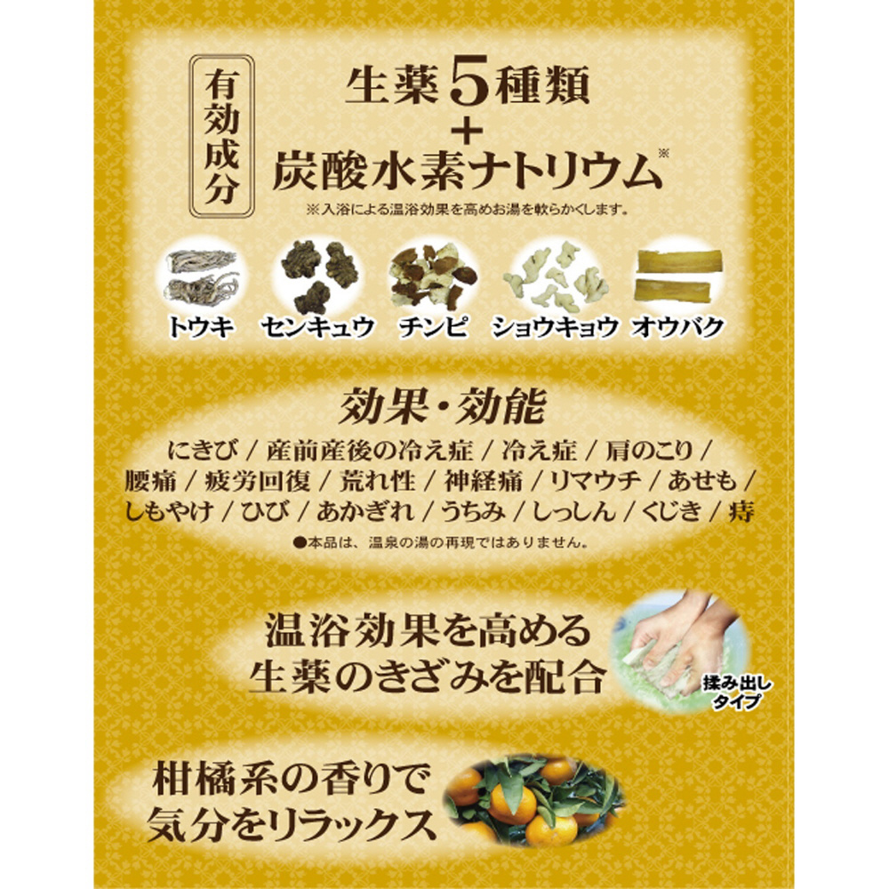 ・無機温泉成分である、炭酸水素ナトリウムに加え、温浴効果を高める生薬「トウキ」「オウバク」「チンピ」のきざみを配合しました。
