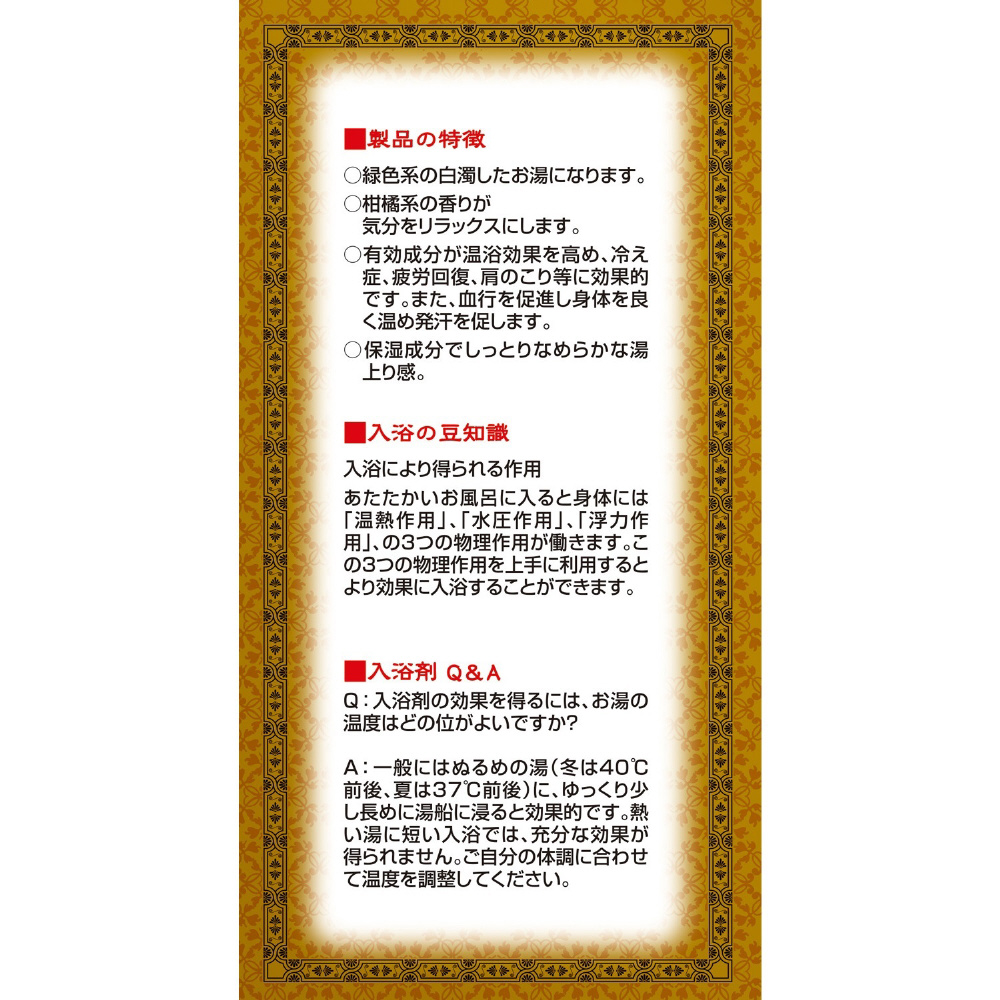 | 効果効能 | 冷え性、肩のこり、腰痛、疲労回復、荒れ性、神経痛、リウマチ、あせも、しもやけ、ひび、あかぎれ、うちみ、しっしん、くじき、痔、にきび、産前産後の冷え性 |
