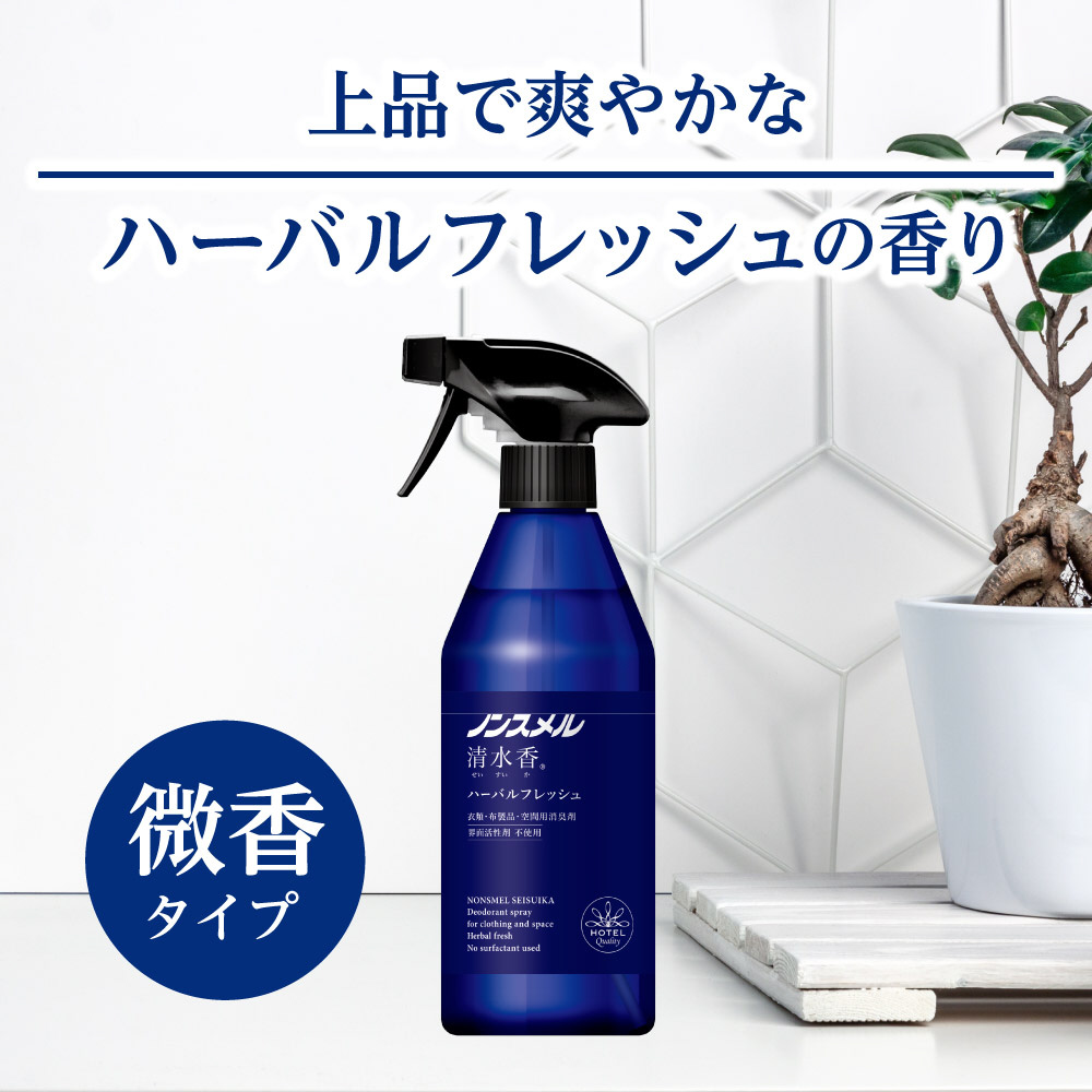 衣類・布製品の気になる汗・体臭・タバコ・料理・ペットなどのニオイを消臭・除菌。ウイルス除去にも。空間にも使用できます。界面活性剤不使用でスプレーした後にベタつきません。速乾タイプ。ハーバルフレッシュの香り。