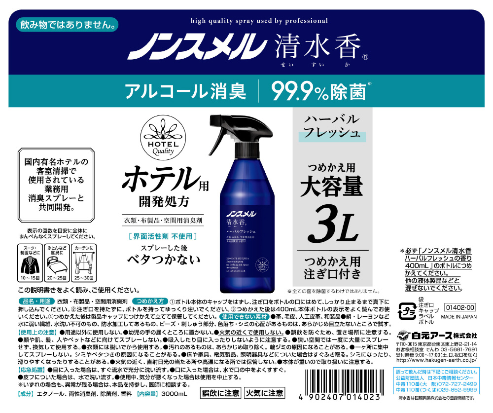ノンスメル清水香 ハーバルフレッシュ 替え大容量3L ハーバルフレッシュ