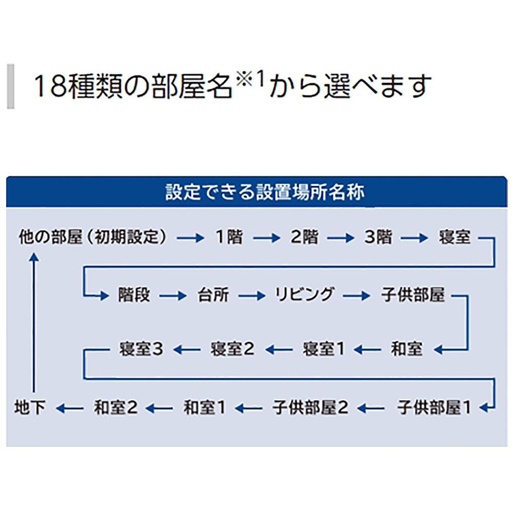 ワイヤレス連動で発報場所を音声で報知。18通りの登録が可能です。(台所・リビング・子供部屋等)