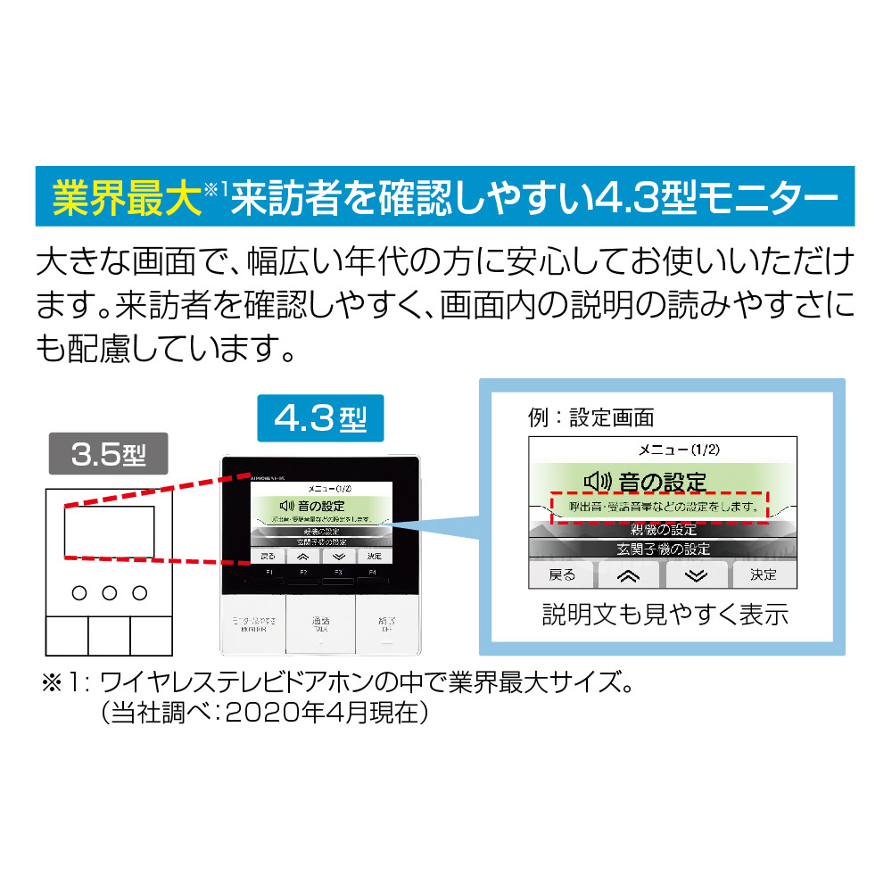 ※4:ワイヤレステレビドアホン業界最大サイズ(2020年3月現在)