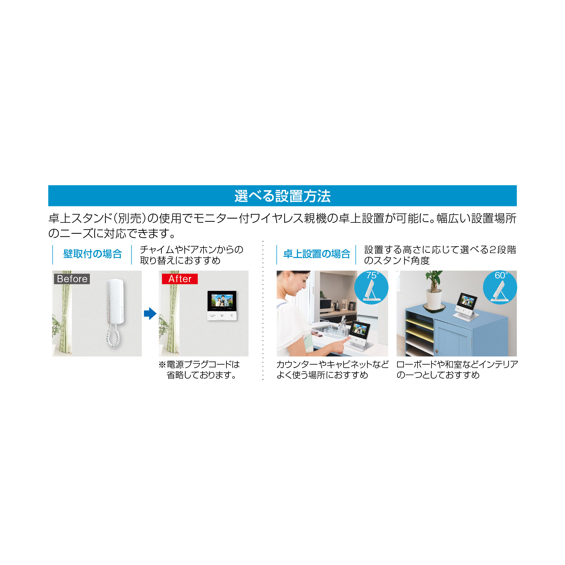 玄関から室内の配線不要。約100mの見通し距離。DECT準拠方式採用電波干渉が少なく安定した通信※1