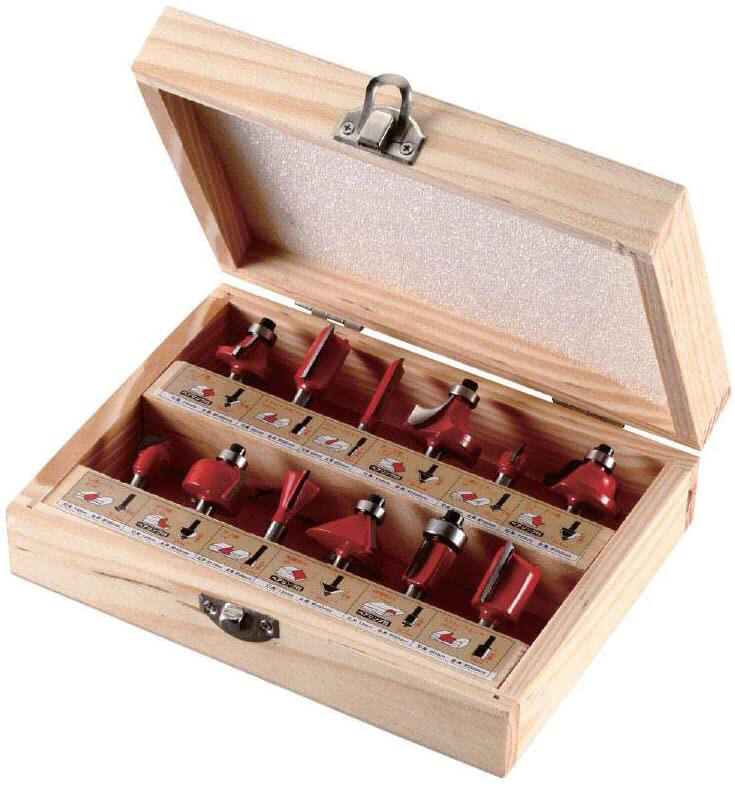 セット内容:角面取り、サジ面取り、ボーズ面取り2種、目地払、ヒョータン面取り、ストレートビット3種、V溝ビット、U溝ビット、アリ錐。軸径:6mm。