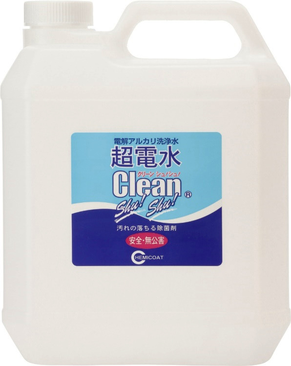 アルカリイオン水100%の除菌洗浄水、超電水クリーンシュ!シュ!の業務用モデル。大容量の4Lで、注ぐのに便利なノズル付きです。