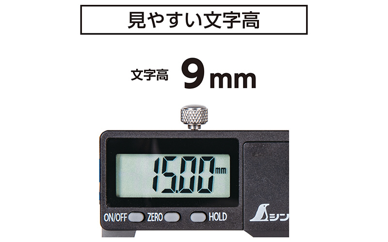 読み取りやすい文字高9mmの大型液晶表示を採用しました。オートパワーオフ機能付です。最小読取値が0.01mmで精密な作業に最適です。比較測定のできるゼロセット機能付です。測定値の固定ができるホールド機能付です。保管や持ち運びに便利なケース付です。