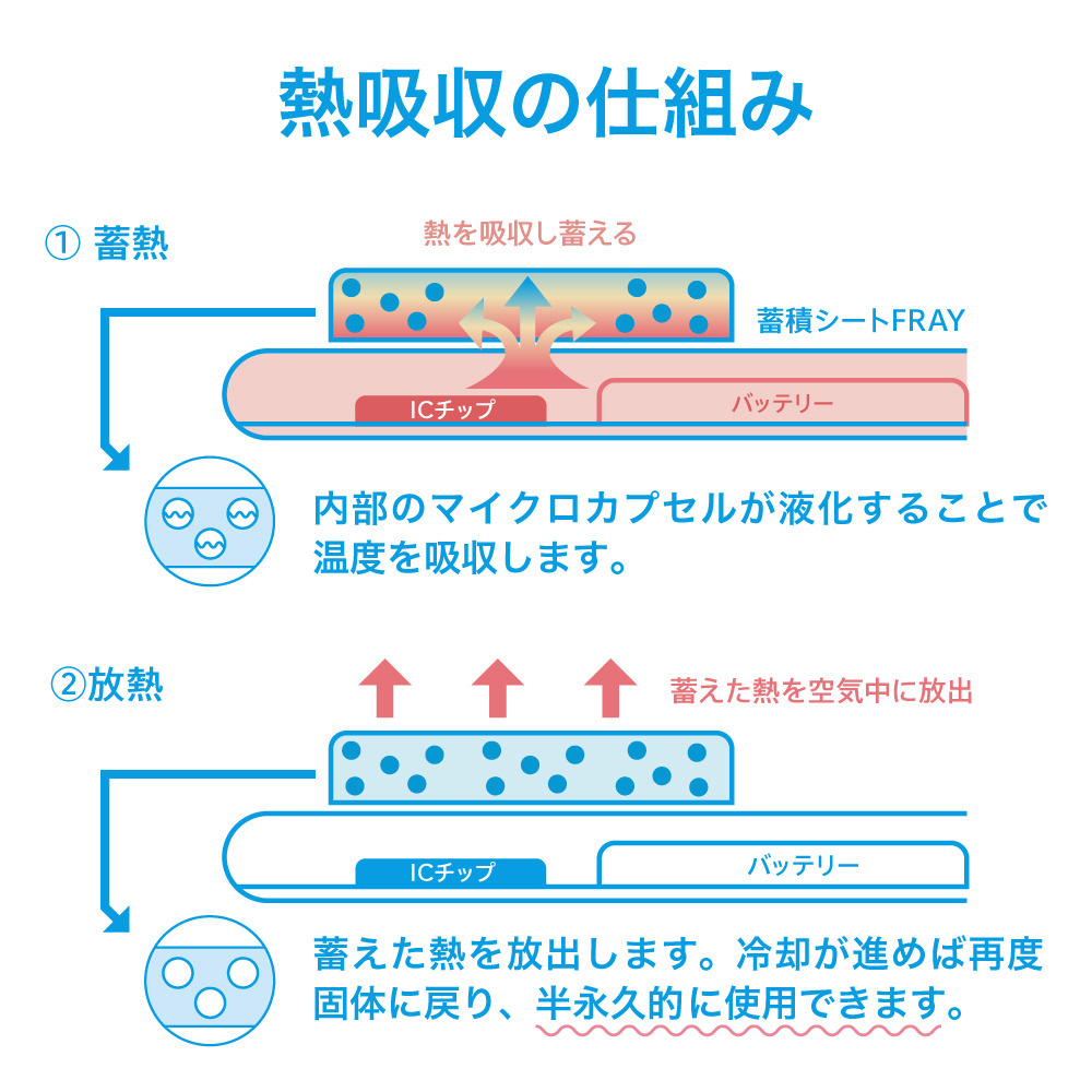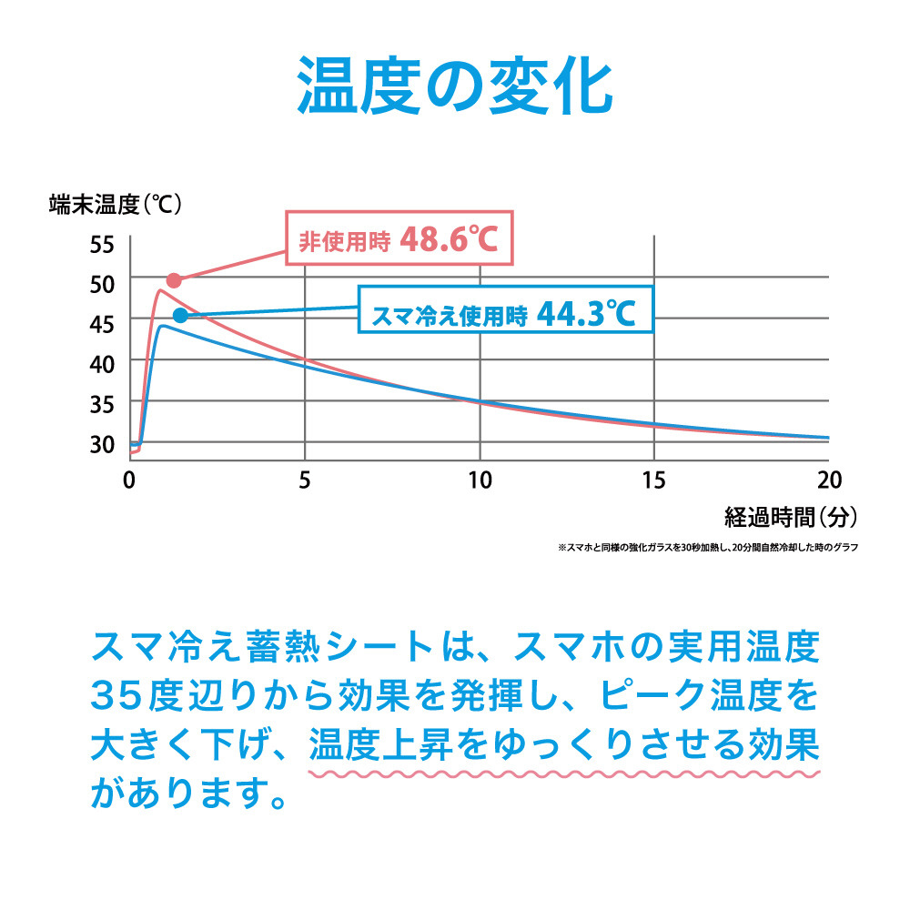 ・熱を吸収して-4.3℃冷やす・発熱によるバッテリーの劣化を防ぐ・ながら充電の発熱を抑制・貼るだけ簡単・動画・ゲーム・ナビ利用に最適・ケースと一緒に使える(※ケースの形状によっては使用できない場合あり)