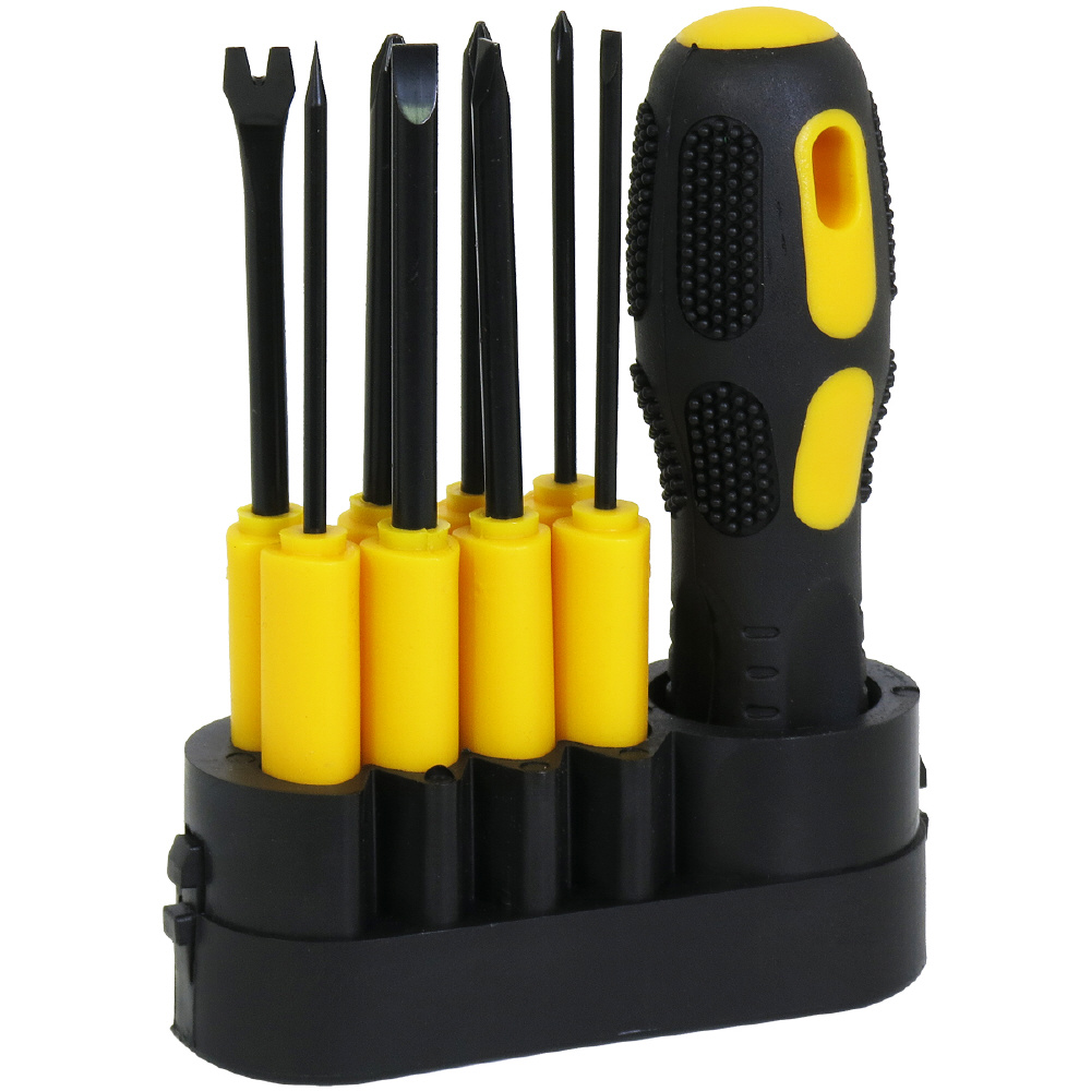 差替ハンドル:-3mm、-5mm、-6mm、+No.0、+No.1、+No.2、千枚通し、釘抜き。ドライバー材質:Cr-V、PP。差替グリップ材質:PP+TPR。