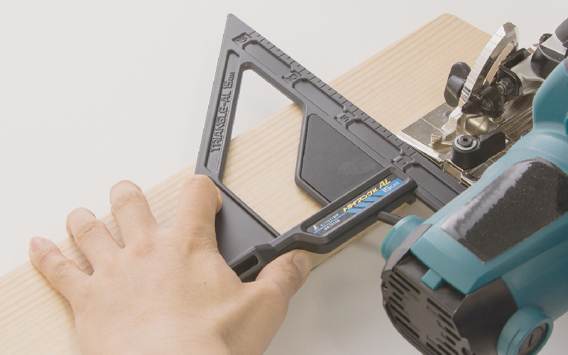 電気丸ノコで、角材やツーバイ材、フロア材を直角、45度に切断するときのガイド定規に。寸法測定に。