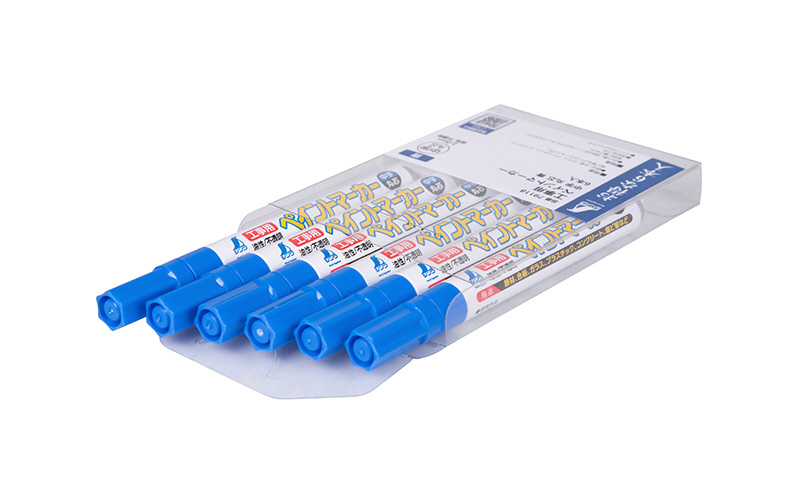 工事用ペイントマーカー中字・丸芯青の6本入り鉄材,合板,ガラス,プラスチック,コンクリート,塩ビ管へのマーキングに。