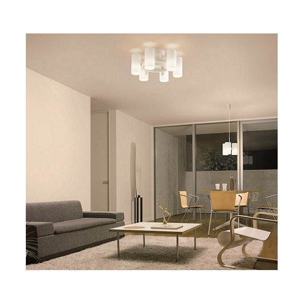 筒形セードを使用したシンプルなデザインのシャンデリア。乳白の灯具がやわらかい光を演出します。