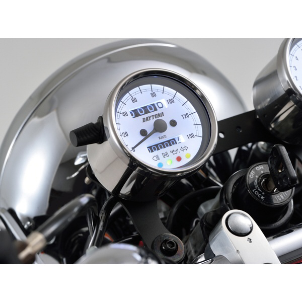 ●夜間でも視認しやすいLEDバックライトの文字盤を採用。インジケーター付きは、ハイビーム、ニュートラル、油圧、ウインカーを内蔵。