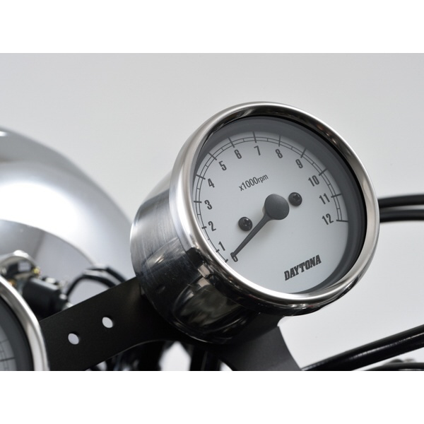 ●クラシカルなパネルデザインで12,000rpm表示のタコメーター(ギヤ比1:5)。