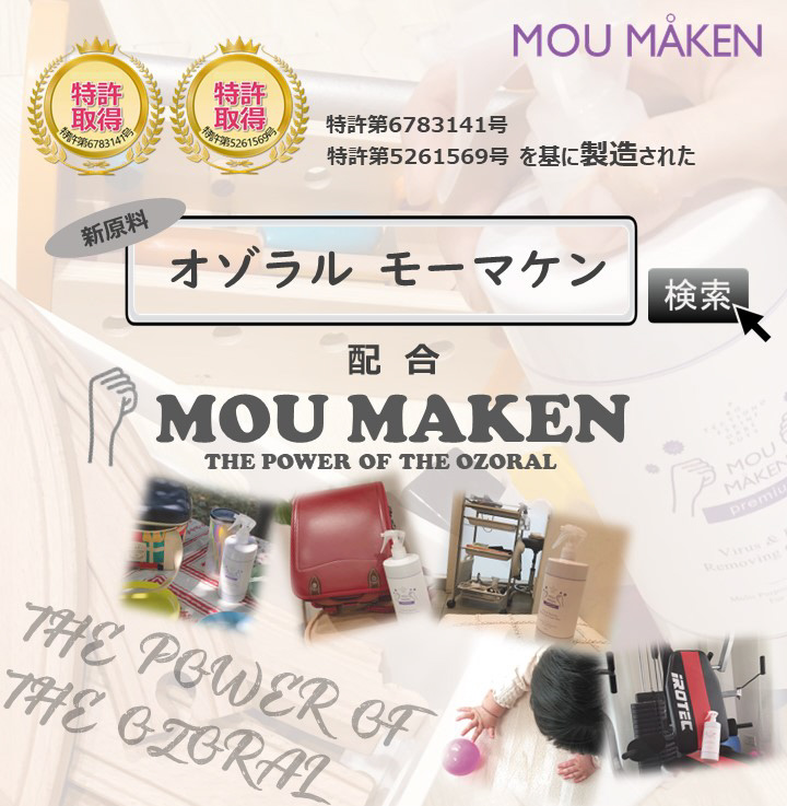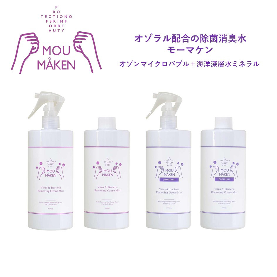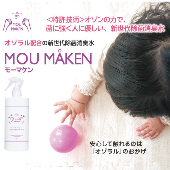 オゾンの力で、菌に強く人に優しい、新世代の除菌消臭水「モーマケン」。新原料オゾラル(海洋深層水ミネラルとオゾンマイクロバブルの化合物)配合。中性、ノンケミカル、アルコールフリー。水のような使い心地で、あらゆるモノの除菌に使えます。