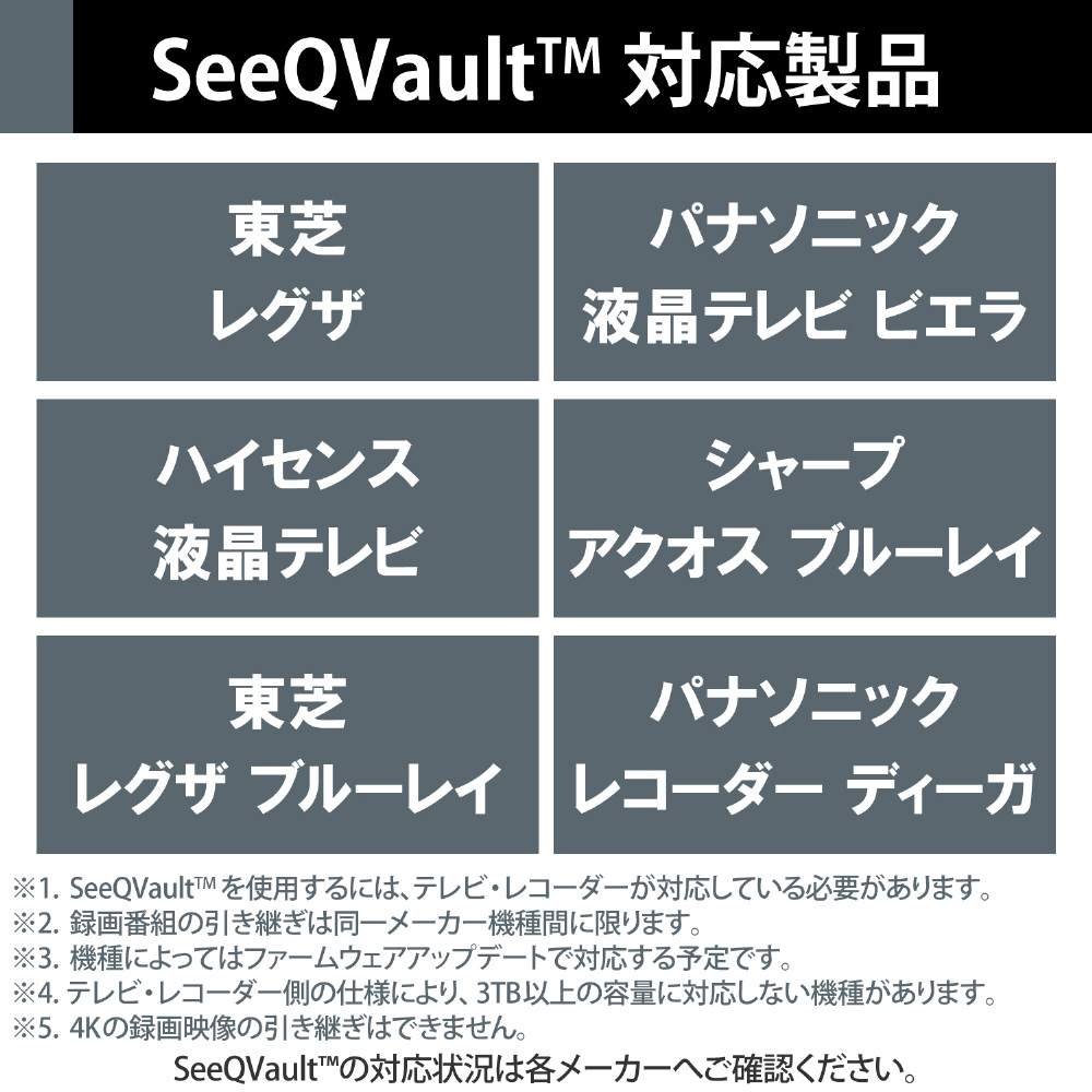 ■テレビやレコーダーを買い換えた際、録画番組を引き継げる“SeeQVault規格”に対応した外付けハードディスクです。